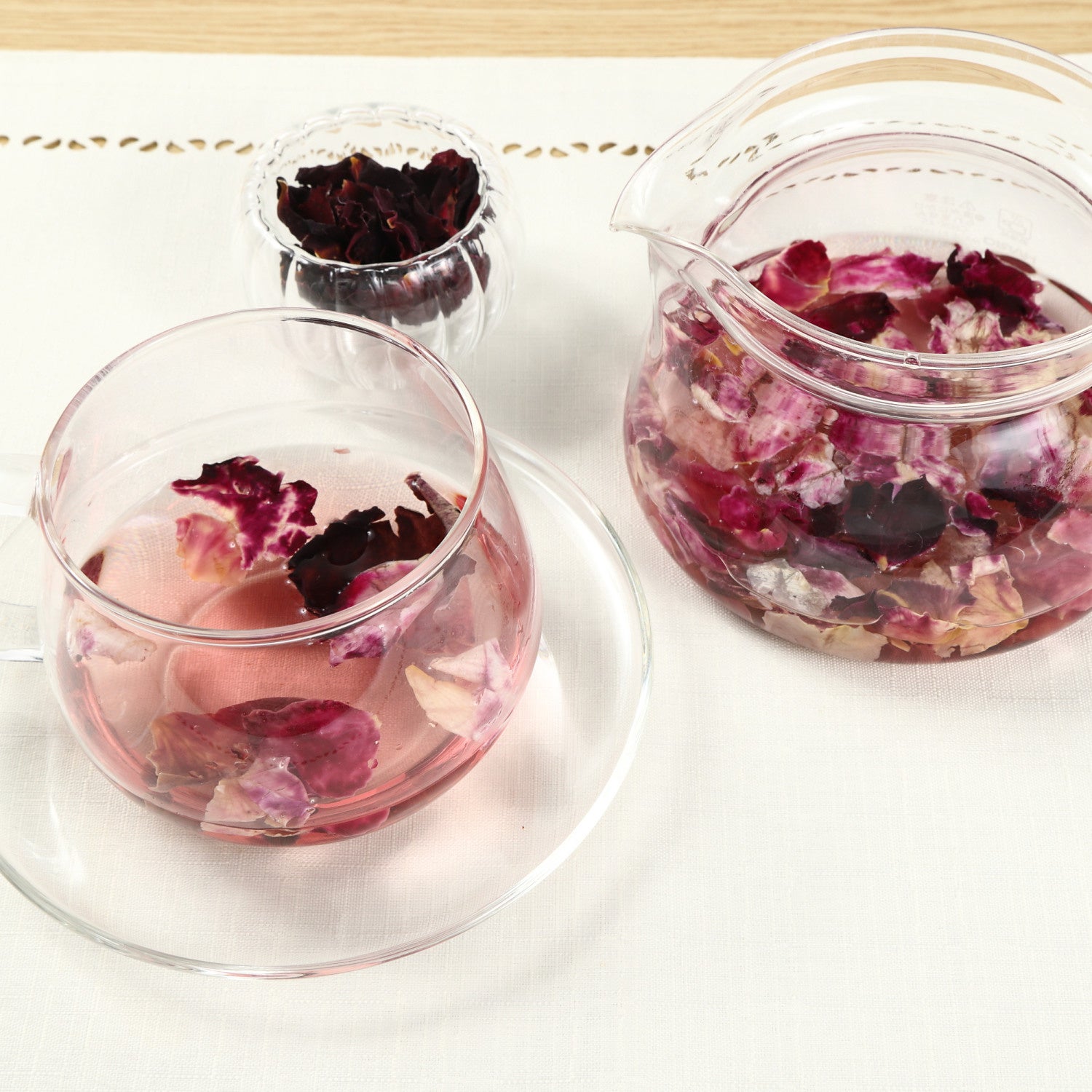 ティーポットにティースプーン3杯(約1g)ほどのローズリーフを入れ、200cc のお湯を注ぎ4~5分ほど蒸らしてお飲み下さい。