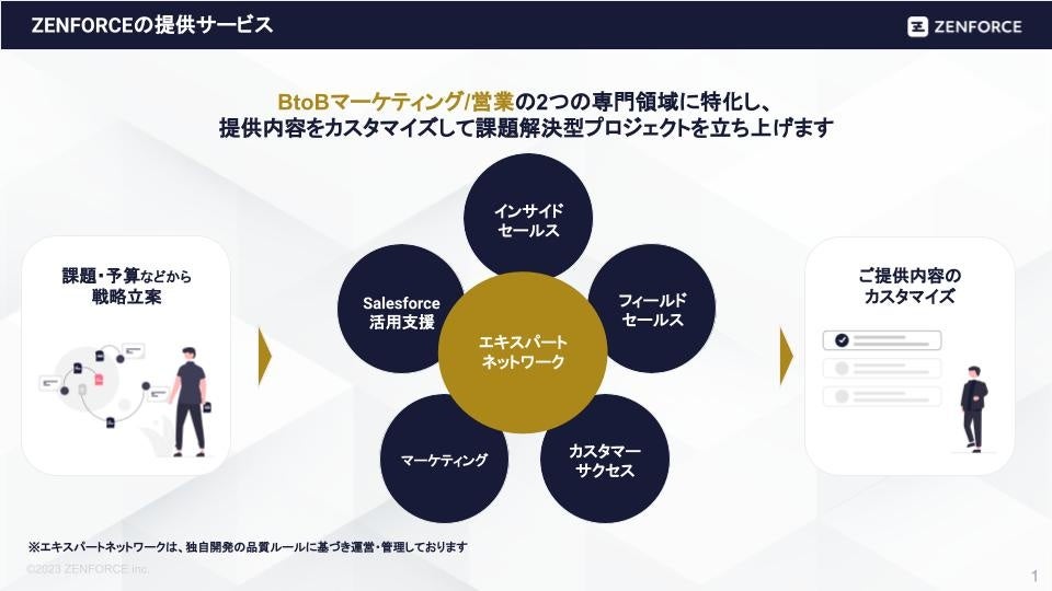 ZENFORCEはBtoBマーケティング/営業に特化した、BtoB実務伴走型ソリューションを提供する会社です。多様化する市場ニーズに応え、事業を拡大するためには、BtoBの営業/マーケティング領域における専門的な知識と戦略が必要不可欠です。ゼンフォースは専門知識を持つハイクラス人材のアサインし、市場の動向に基づいた効果的な戦略開発と実行を支援します。