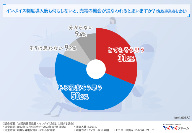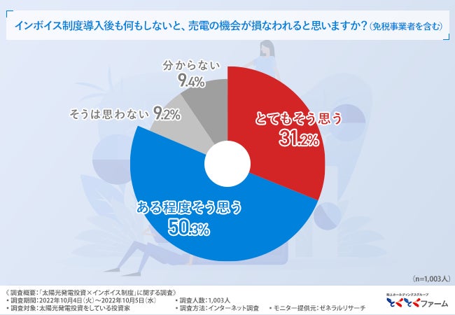 そこで、「インボイス制度導入後も何もしないと、売電の機会が損なわれると思いますか?(免税事業者を含む)」と質問したところ、『とてもそう思う(31.2%)』『ある程度そう思う(50.3%)』『そうは思わない(9.2%)』『分からない(9.3%)』という回答結果になりました。