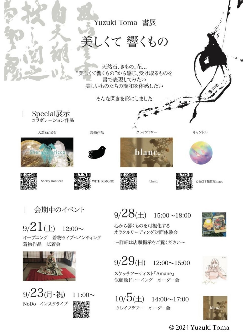 また、会場にはYuzuki Toma 氏の書道作品の他に、着物やお花、天然石も展示される予定です。