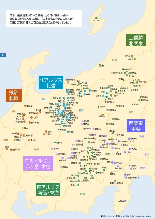日本山岳会選定の日本三百名山から日本百名山を除く200山に、深田クラブ選定の荒沢岳を加えた201山を掲載して、A3二つ折でコンパクトに一覧できます。