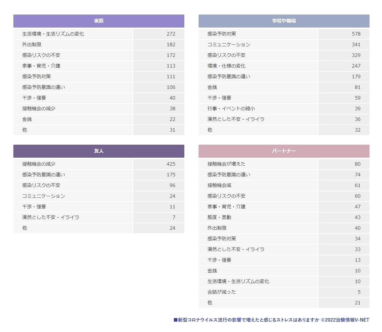 友人とは異なり気軽に会うことができるパートナーに対しては、接触する機会が増えた事で衝突が増えストレスを感じている方が多くいました。