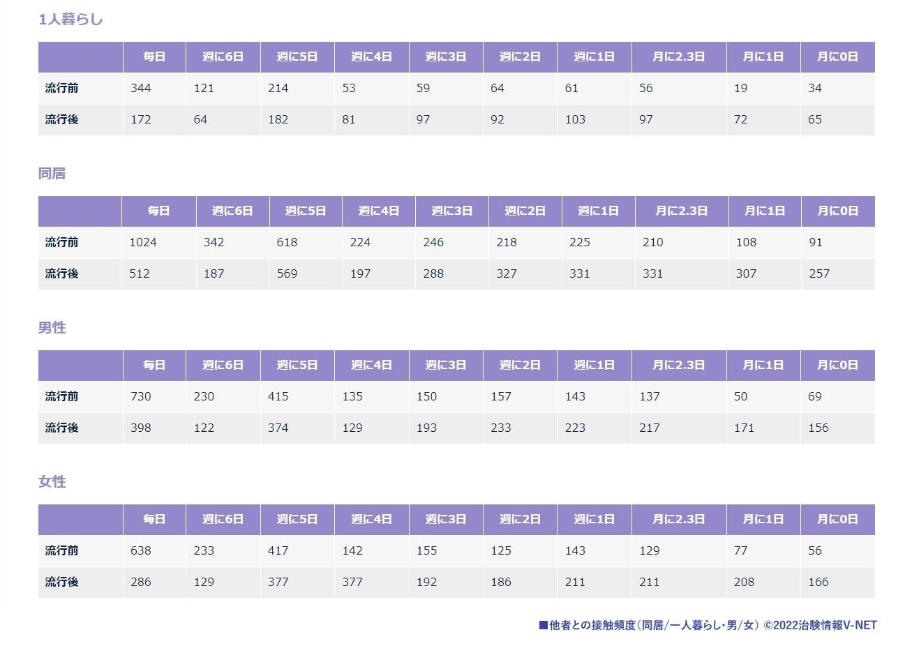 また男女別や同居・一人暮らし別の他者との接触頻度を見ても流行前と流行後では接触頻度を控えている様子をうかがえます。
