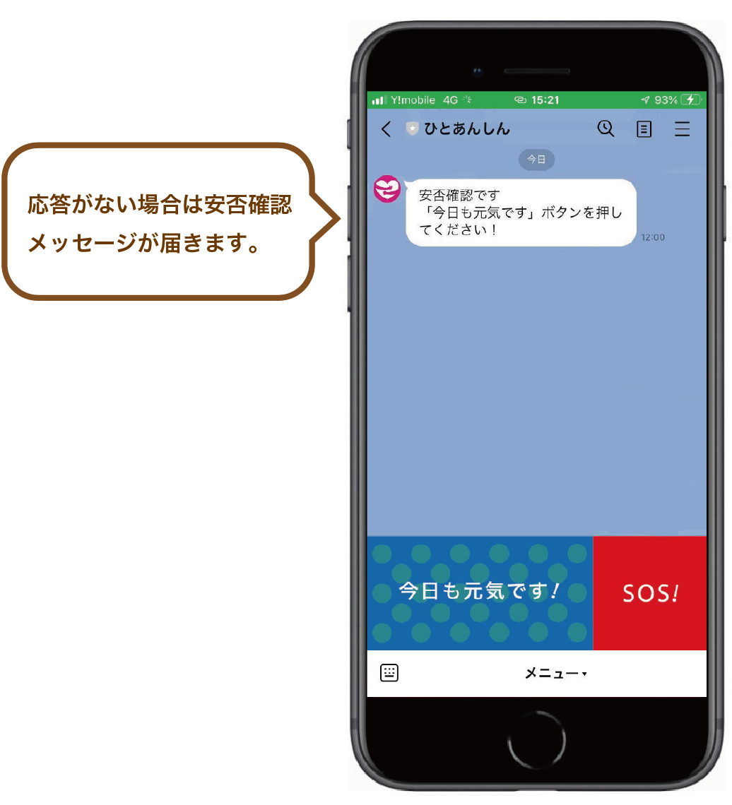 『ひとあんしん』は私たちが普段使っているLINEで利用できます。新たなアプリや設備は一切必要ありません。そして1日に1回ボタンをタップするだけで安否通知が完了します。