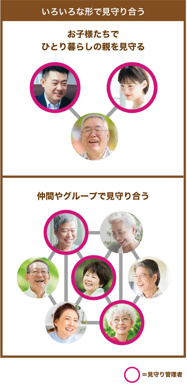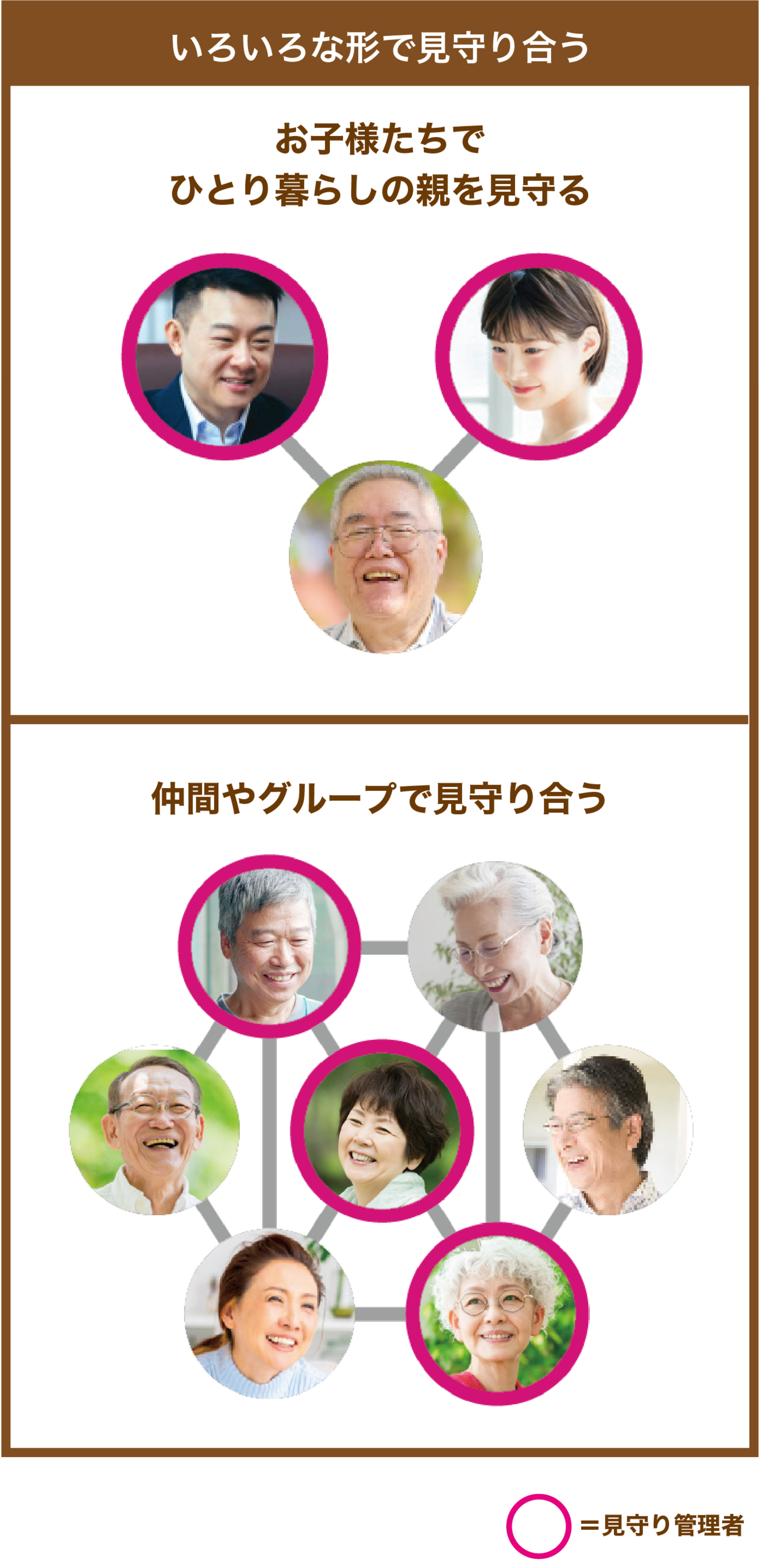 A:仲のよい知人同士でグループを作ったり、ひとり暮らしのご家族を見守ったり、訪問介護されている施設でご利用されたり、使い方やグループのメンバー構成はご自由です。