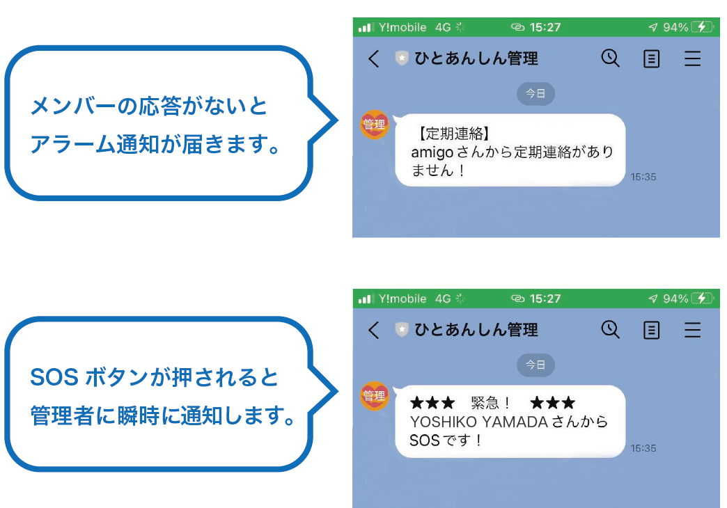 15時までにメンバーから応答がない場合は、管理者にアラーム通知が届きます。