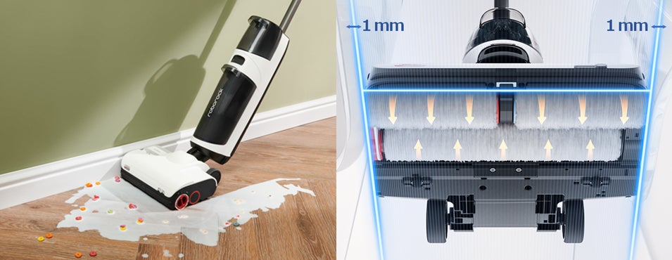 1万7,000Paのパワフルな吸引力に加え、壁ぎわ1mmまで接近する3つのローラーブラシが同時に水拭きを行います。微細なハウスダストから液体が混ざった床の食べこぼし汚れなど、部屋の隅々まで床を二度拭きしたような仕上がりでキレイに拭き上げます。左右40度まで回転するヘッドや最長43分、最大300㎡稼働※1する大容量バッテリー、汚れのレベルに合わせた吸引力と水量の自動調整機能など、使い勝手にもこだわっています。また、掃除を終えてドックに戻すと、ローラーブラシを自動で洗浄・乾燥するため、お手入れはゴミと汚水を捨てるのみです。