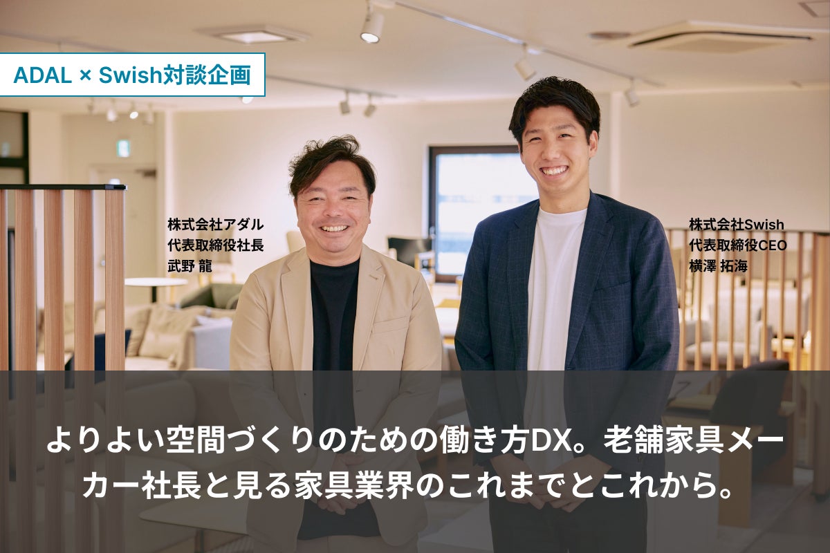 「空間づくりの常識をアップデートする。」をミッションに掲げる株式会社Swish(本社:東京都品川区、代表取締役CEO:横澤 拓海)は、株式会社アダル代表取締役社長・武野 龍氏とのスペシャル対談企画 前篇「よりよい空間づくりのための働き方DX。老舗家具メーカー社長と見る家具業過のこれまでとこれから。」を公開したことをお知らせします。