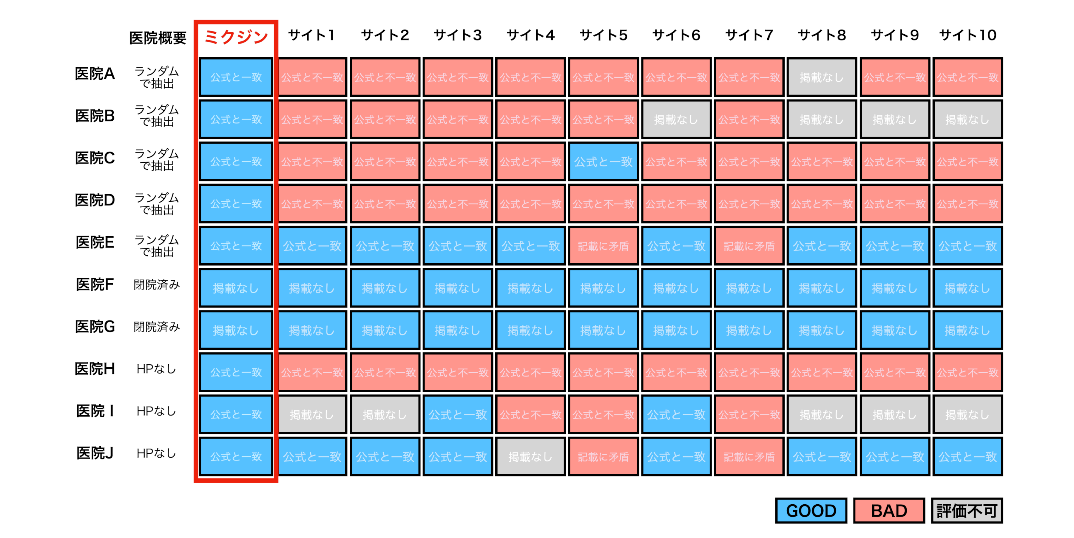 ミクジンが正しい情報を掲載できているのに対し、誤った情報を掲載しているサイトが目立ちます。今回の調査結果で見ると正答率は50%程度。中には数年間情報が更新されてないケースも散見され、コロナ禍において試行錯誤する医療機関の対応をキャッチアップしていない状況が見てとれます。