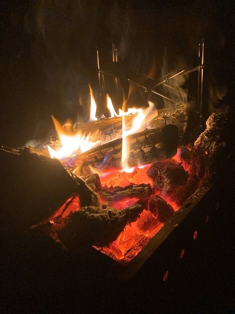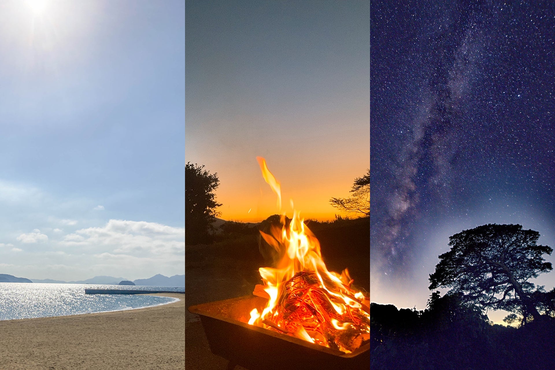 写真左から:瀬戸内海が眼前に広がる里山近くの浜辺 /薪割り後の焚き火/明かりの少ない里山ならではの満天の星空