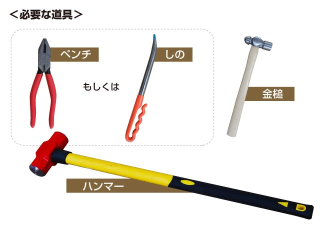 3kg以上のハンマー、しの又はペンチ、金槌をご準備ください。