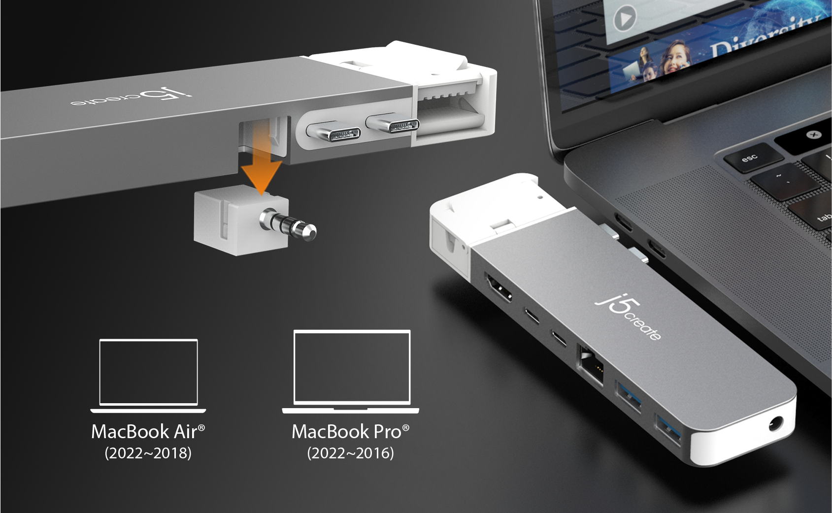 本機は2021年に登場した新仕様MacBook Pro14インチと16インチモデル向けのデザインですが、MacBook Pro13/15インチおよびMacBook Airなど左側が2ポートUSB-Cしかないモデルにも対応しています。本機の3.5mmプラグは取り外せる設計なので、プラグを取ることで問題なく接続することができます。