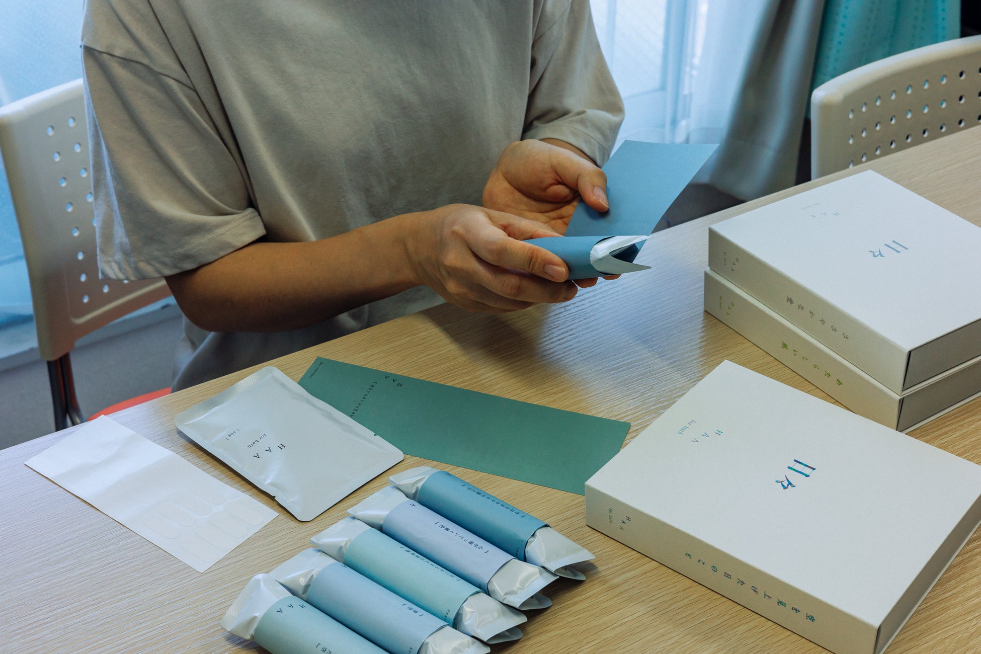 宮城県の福祉施設の所長さんとの出会いをきっかけに、手作業で行っている「HAA for bath 日々」の紙で包む作業の一部をお願いしています。従来1枚のシールで留めていたものを、作業をしやすいよう2枚にするという少しの工夫でハンディのある方も作業ができるようになります。