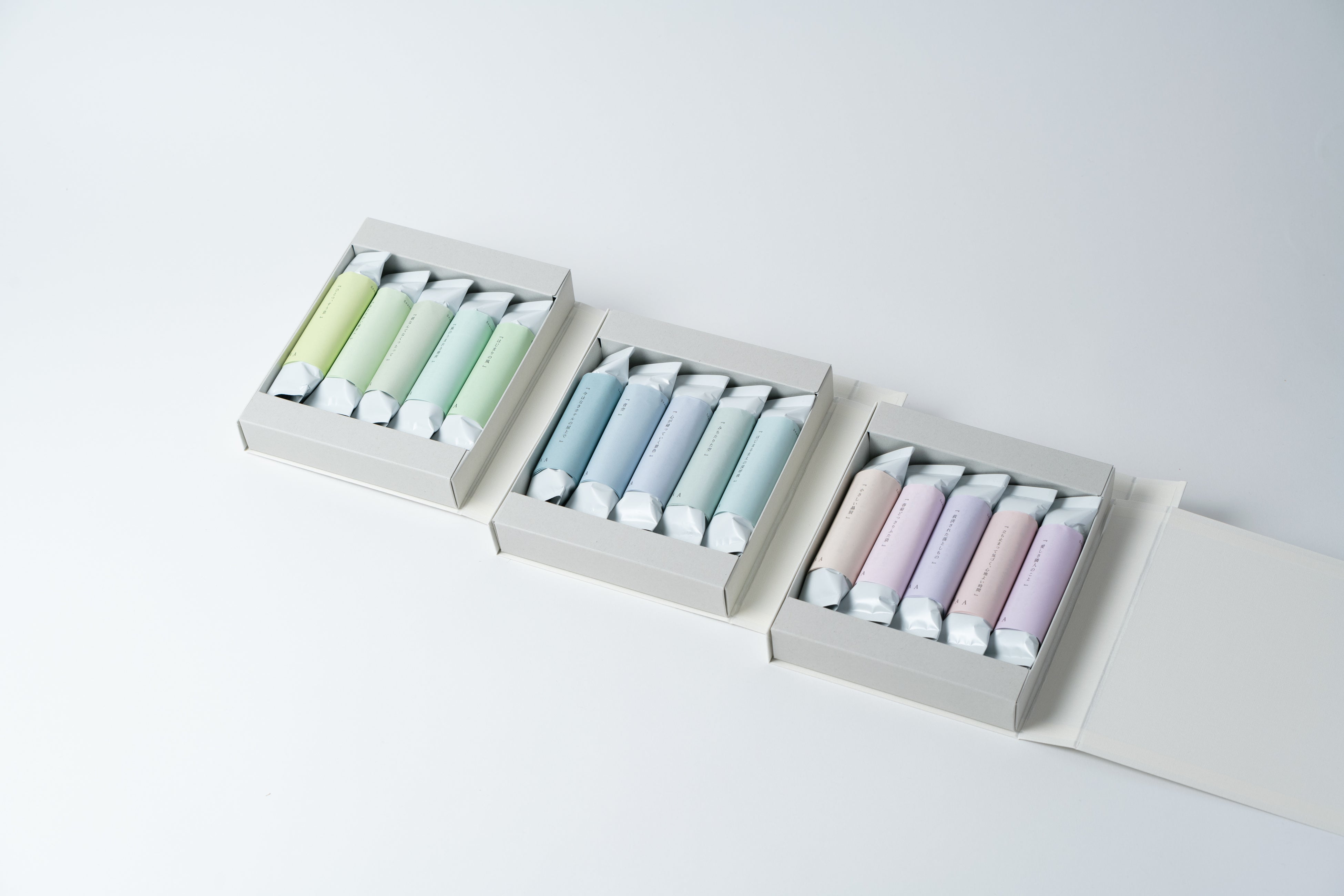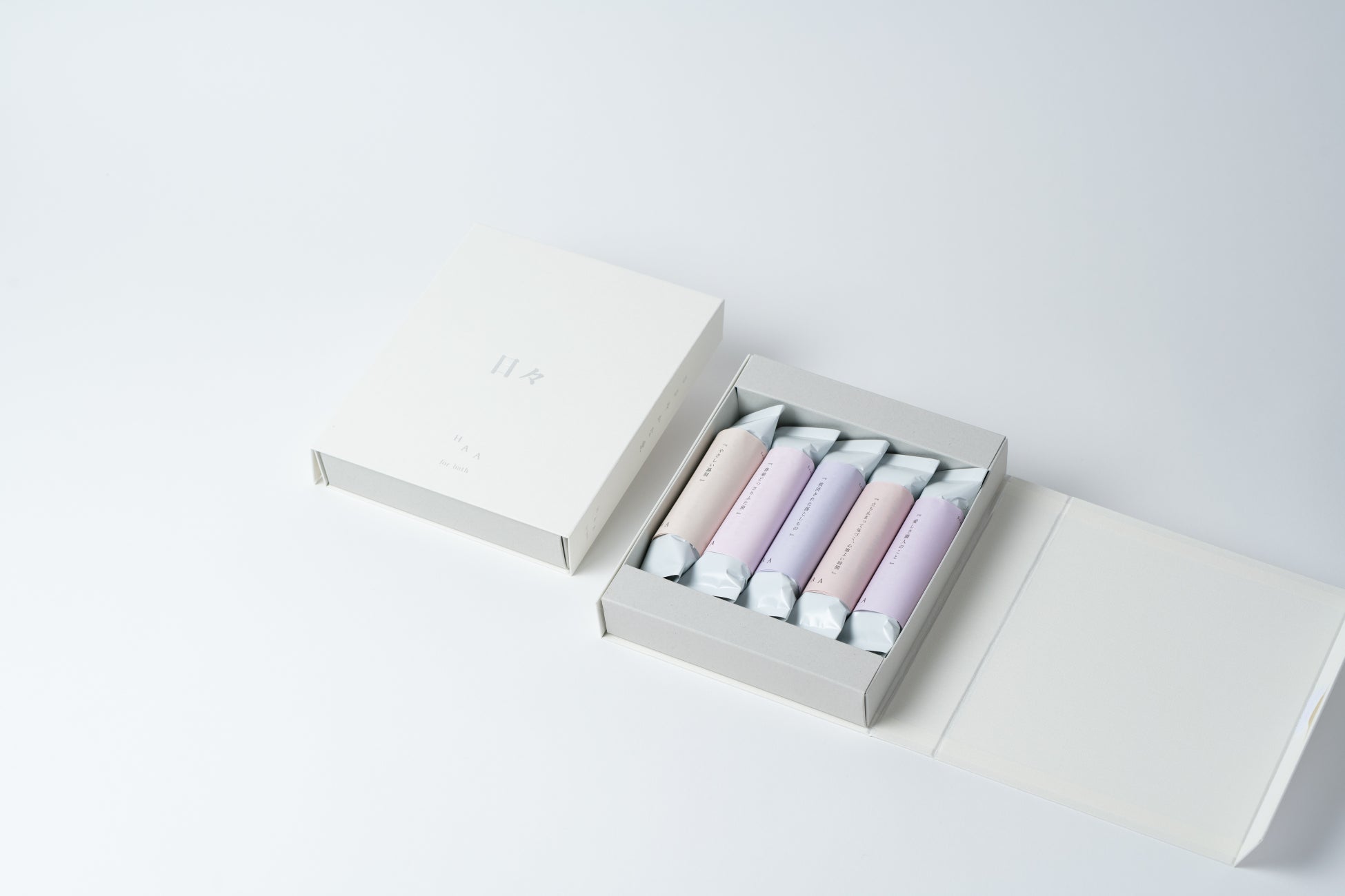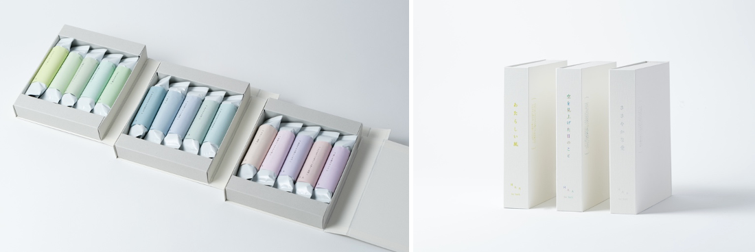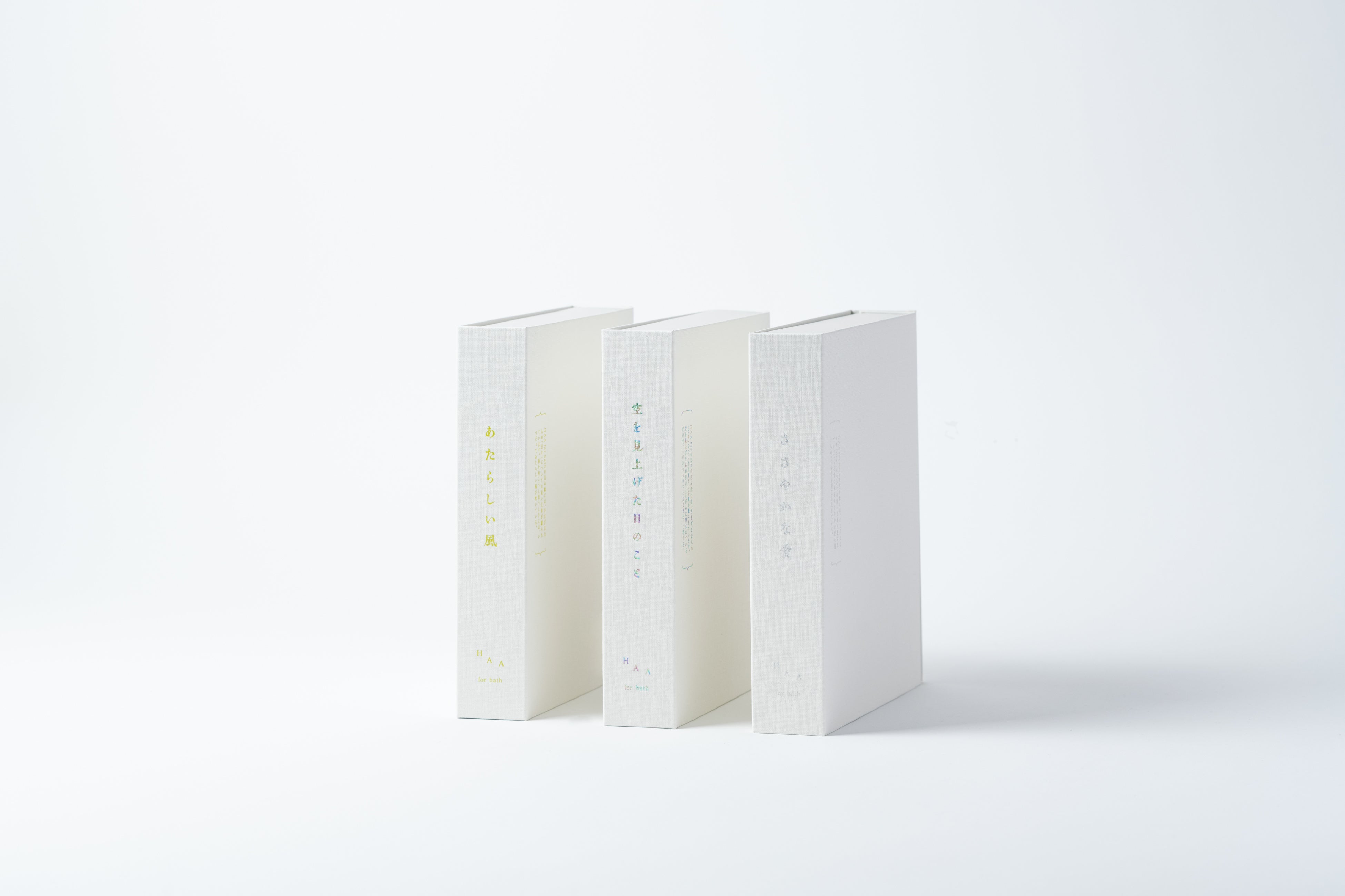 贈る気持ちを代弁する3つのテーマに合わせた「ことばに包まれた入浴剤」5個入りのギフトボックスです。入浴剤は全て同じHAA for bath(無香料)で、包み紙に書いてある言葉が全て異なっています。ギフトで受け取った方がそっと本棚から取り出せるようなデザインで、それぞれのテーマに合わせたパッケージでご用意いたしました。