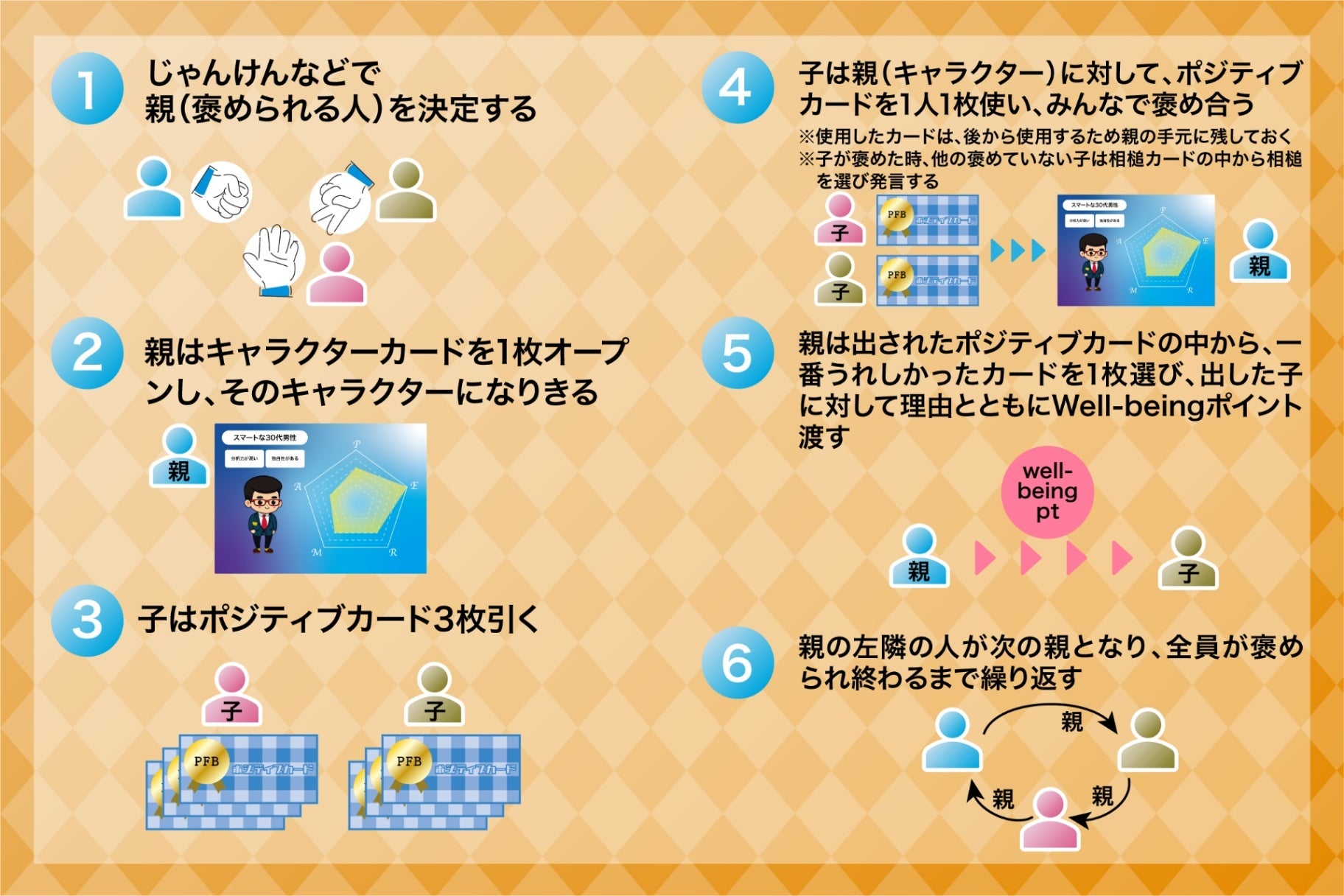 本ゲームでは、褒め合う・認め合うことを体験することによって、良好な関係を構築するためのコミュニケーション手法を学びます。
