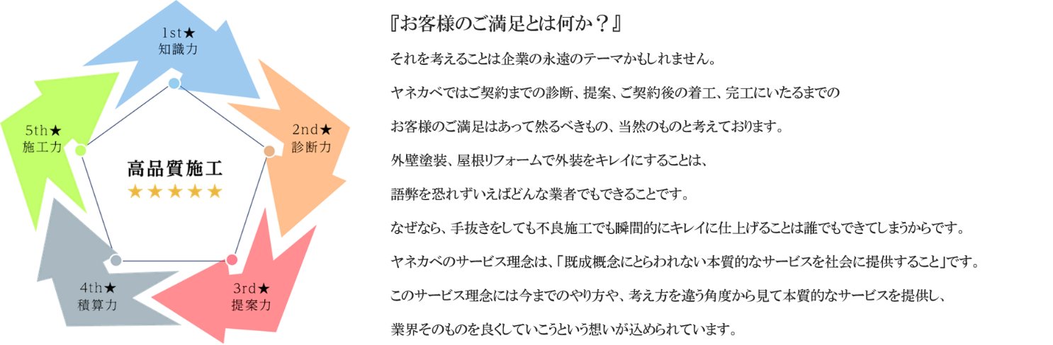 知識力・診断力・提案力・積算力・施工力を追求したヤネカベのサービスを、外装リフォーム業界の標準施工にしていくことが使命だと考え、今後とも業界全体のサービス品質、信頼度のさらなる向上を目指しています。