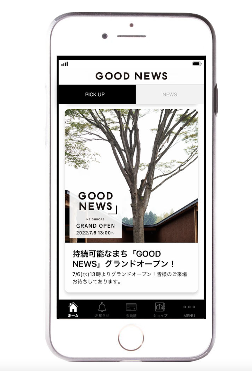 栃木県・那須に誕生した新たなまち「GOOD NEWS」に関する最新情報や、施設での取り組みなどを発信するGOODNEWSの公式アプリが誕生。アプリでの会員登録で、店頭でのお買い物毎に1%のサステナブルポイントが貯まります。貯まったポイントは、GOOD NEWSで取り組むサステナブルアクションに運用させていただくことで、ご来場の皆様の日々のお買い物を「持続可能なまちづくり」に繋げていきたいと考えています。また、通常 500円かかる GOOD NEWS施設の駐車場が無料になる特典もご用意。