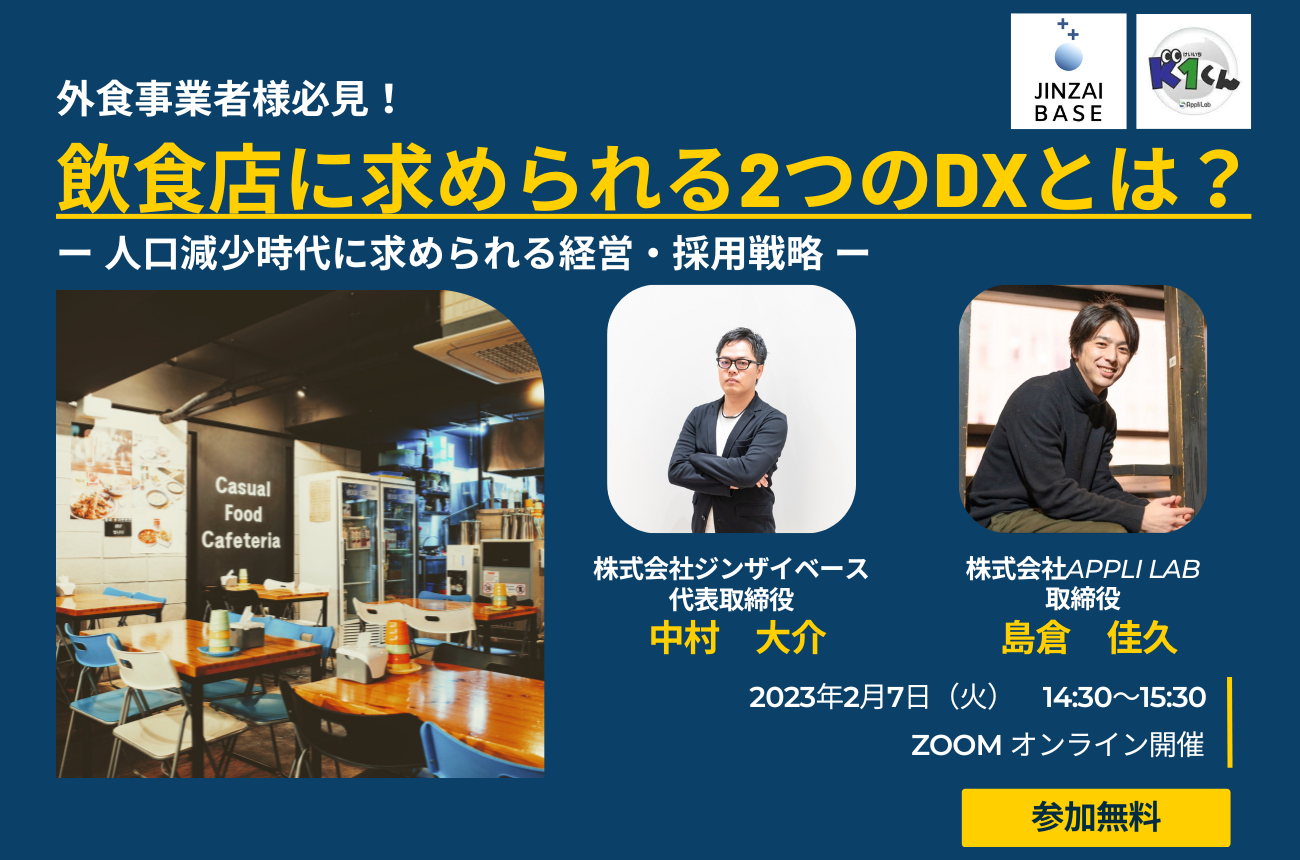 株式会社ジンザイベース(本社:東京都千代田区、代表取締役:中村大介)は、株式会社APPLILAB(本社:東京都千代田区、代表取締役:菅野壮紀)と合同で『飲食店に求められる2つのDXとは?- 人口減少時代に求められる経営・採用戦略 -』をテーマにオンラインセミナーを2月7日(火)に開催いたします。