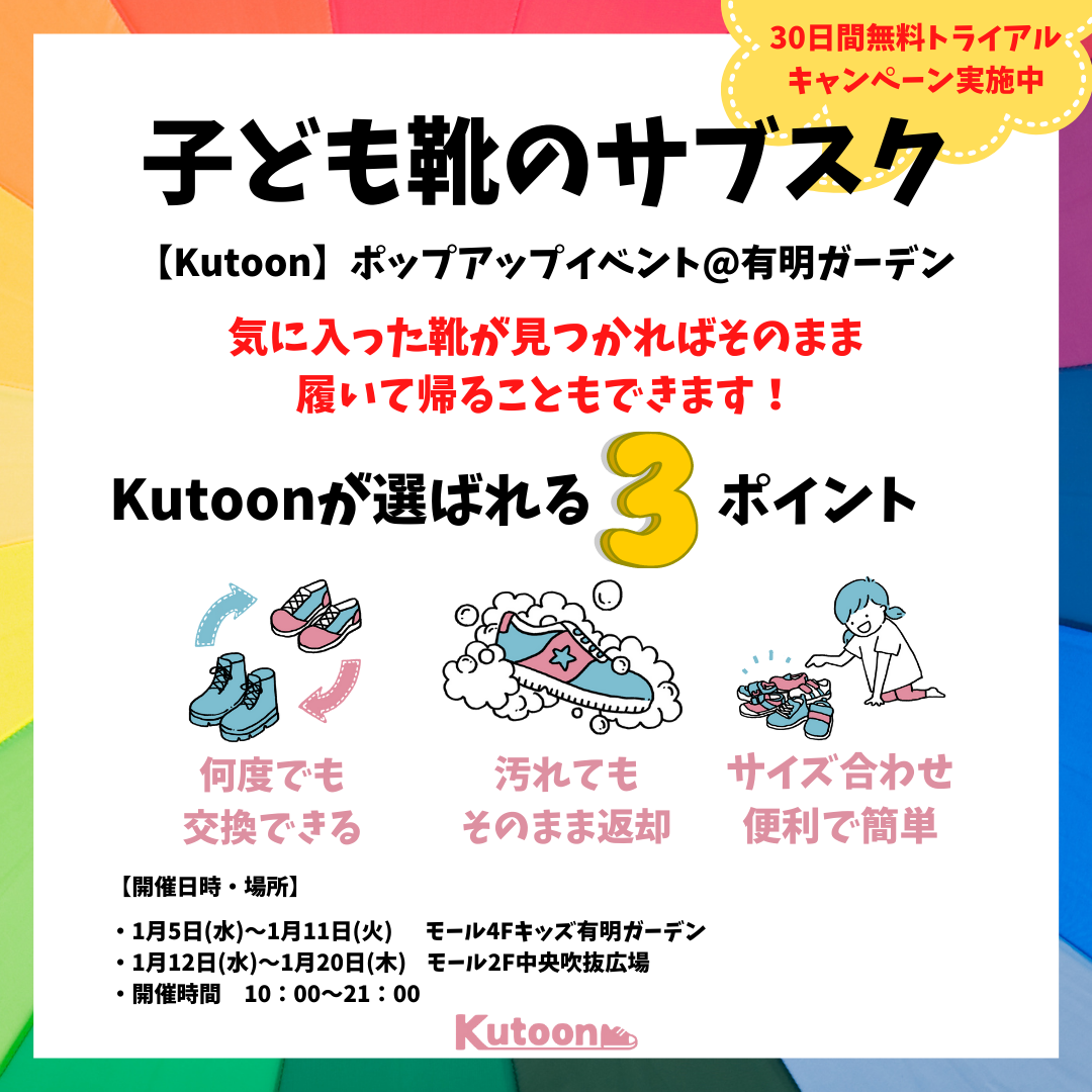 日本初の子供靴レンタルのサブスクリプションサービス「kutoon/クトゥーン」を運営する合同会社SlowFast(本社:東京都墨田区、代表社員:谷口昌優)は2022年1月5日(水)-20日(木)までの16日間、有明ガーデン(東京都江東区)にてポップアップイベントを開催します。