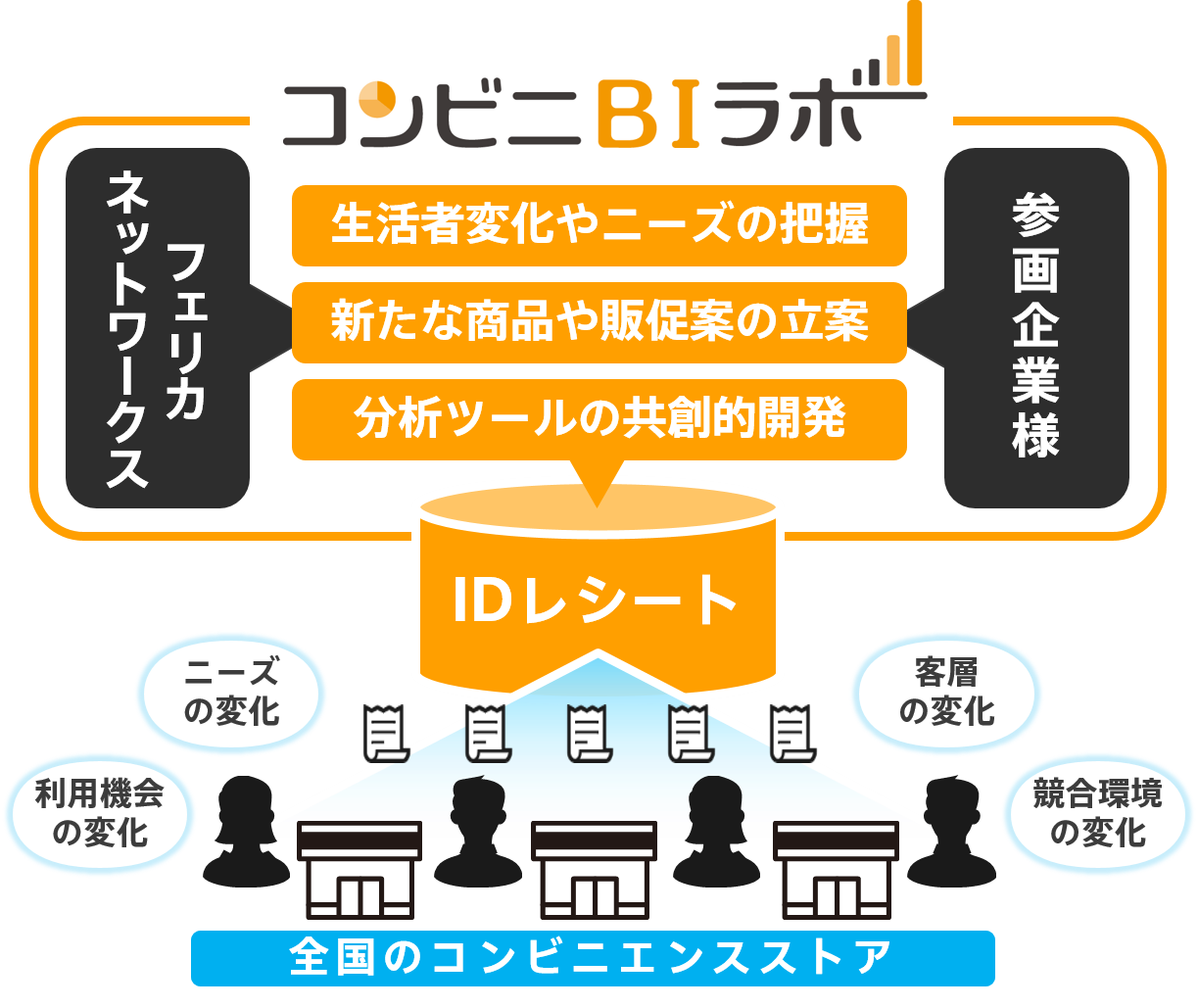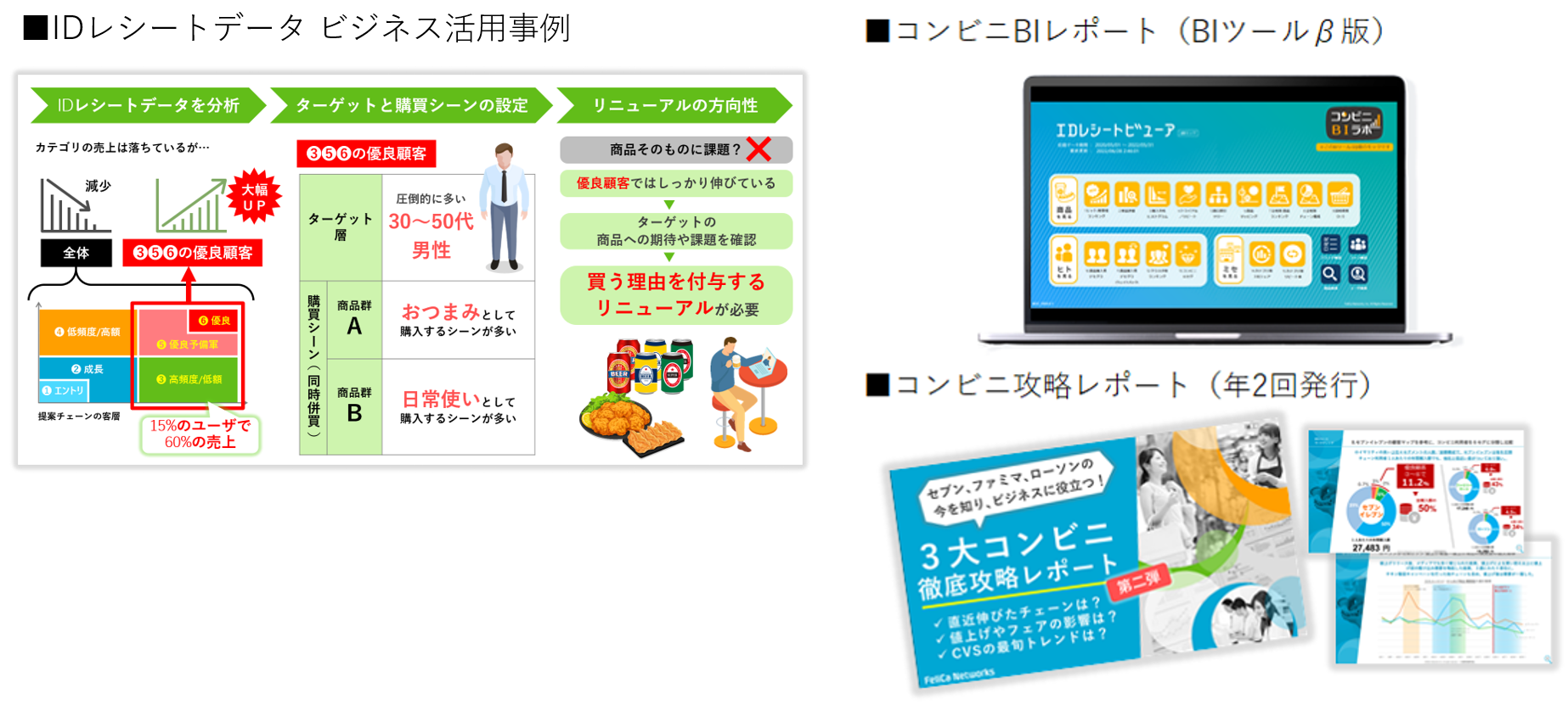 コンビニエンスストア、スーパー、ドラッグストア、外食チェーンなど計600チェーンを対象に、独自の店舗マスタや商品マスタなどを活用し約3万人のお買い物レシート(以下IDレシート)から自然な購買データを収集。メーカーおよびリテール向けに手軽な操作で購買分析をすることができるマーケティングBIツールを提供しています。
