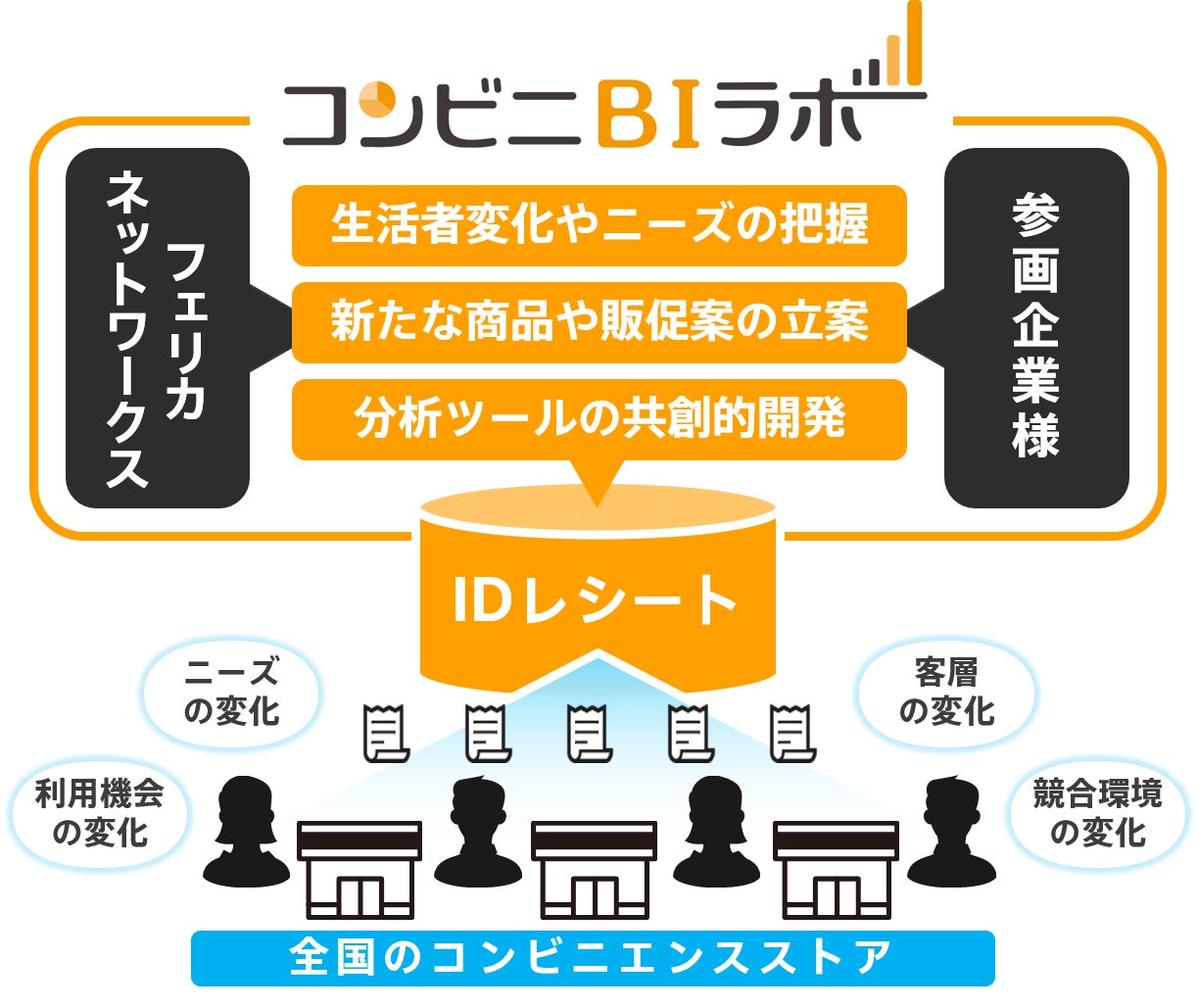 フェリカネットワークス株式会社(以下フェリカネットワークス)は、生活者の買い物レシートを収集・分析し、メーカーや流通企業に分析データを提供することで、商品開発や販促の課題を共に考える共創の場 「コンビニBIラボ」 を昨年開設しました。今月第一期の活動が終了しますが、ラボ参画企業からのご好評と今後へのご期待を受けて、11月より大手コンビニチェーンが参画した第二期を開始します。