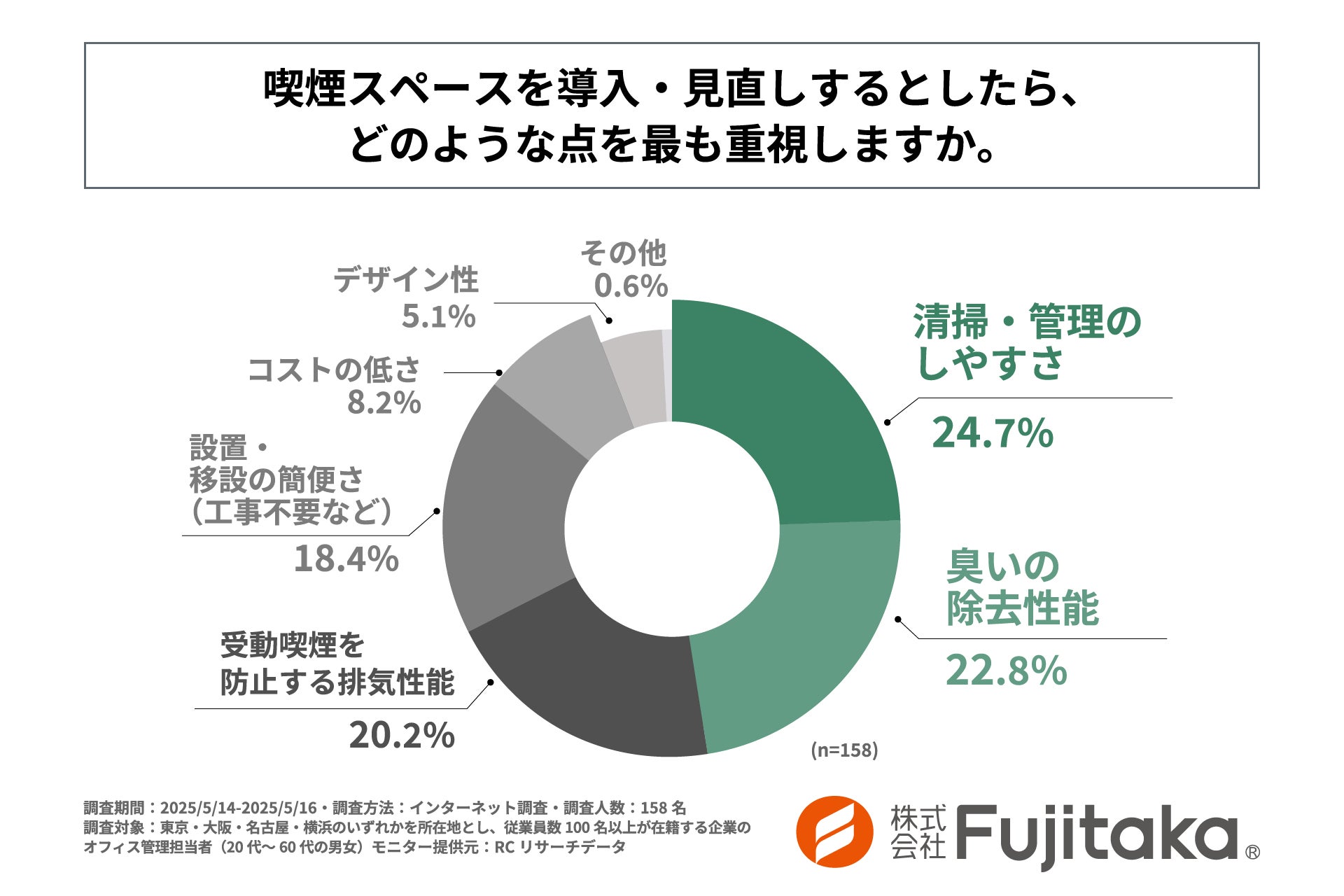 調査の最後、「喫煙スペースを導入・見直しするとしたら、どのような点を最も重視するか」を尋ねる設問の回答で多かったのは、1位が「清掃・管理のしやすさ」で24.7%、2位が「臭いの除去性能」で22.8%、3位が「受動喫煙を防止する排気性能」で20.2%という結果になりました。