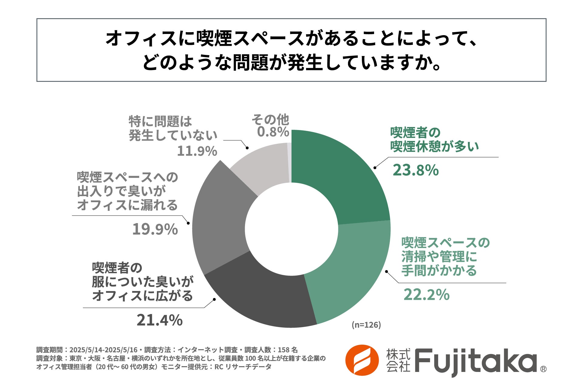 続いて、建物の内外問わず、オフィスに喫煙スペースがあると回答された方に「オフィスに喫煙スペースがあることによって発生している問題」を尋ねる設問への回答では、1位が「喫煙者の喫煙休憩が多い」で23.8%、2位が「喫煙スペースの清掃や管理に手間がかかる」で22.2%、3位が「喫煙者の服についた臭いがオフィスに広がる」で21.4%という結果になりました。