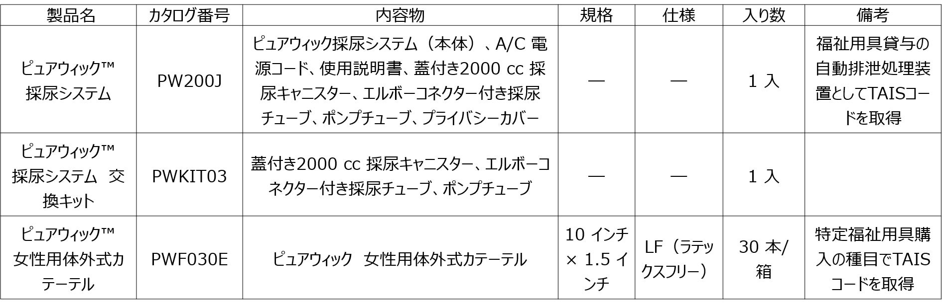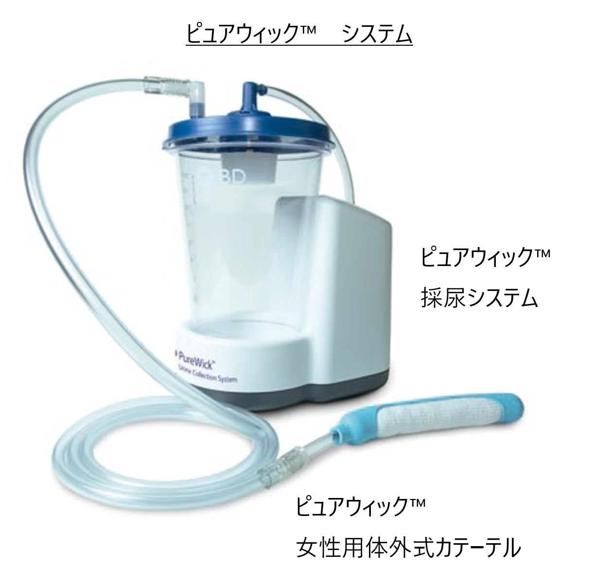 「ピュアウィック™ システム」は、おむつなどに代わる女性のための排尿ケア製品で、体外式カテーテル「ピュアウィック™ 女性用体外式カテーテル」(以下、ピュアウィック 体外式カテーテル)を、専用の吸引装置「ピュアウィック™ 採尿システム」(以下、ピュアウィック 採尿システム)に接続して自動的に尿を吸引する装置です。