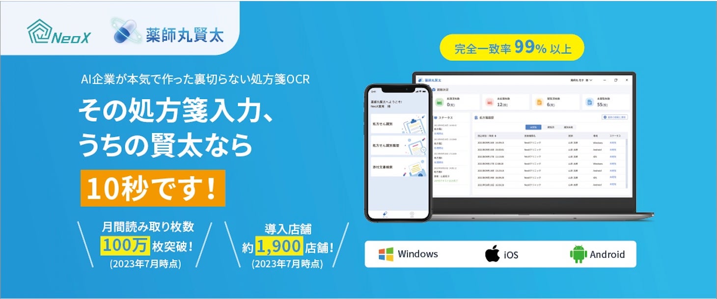 NeoX株式会社(東京都渋谷区 代表取締役 何書勉)が提供する、調剤薬局向け処方箋入力支援AI-OCRサービス「薬師丸賢太」は、2023年7月期に処方箋読み取り枚数が月間100万枚を突破、2023年の累計処方箋読み取り枚数が500万枚を突破したことをお知らせいたします。