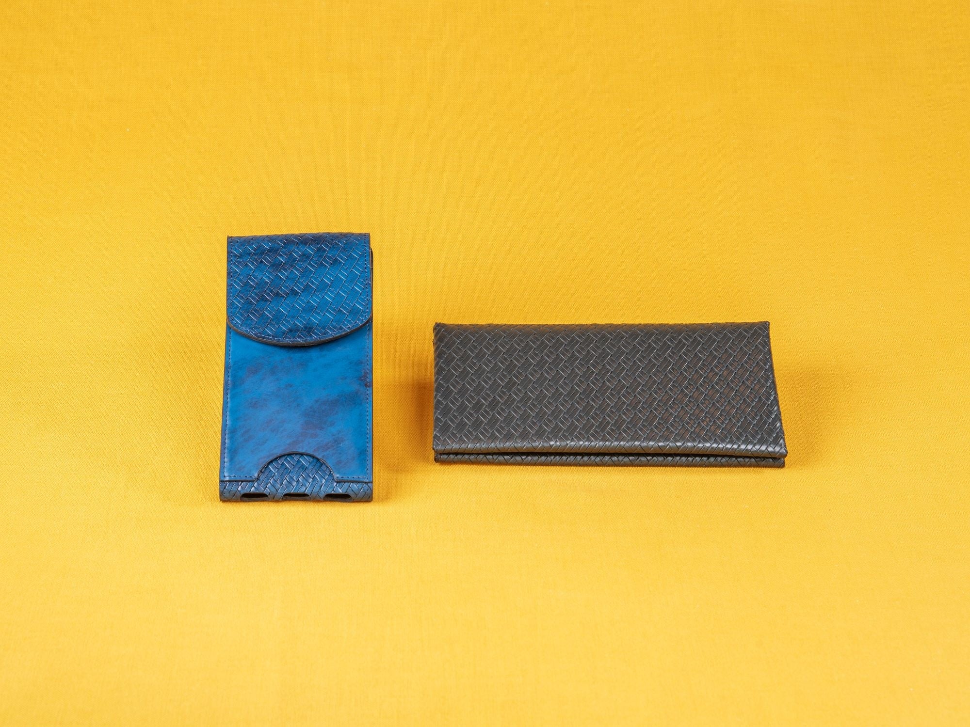概要:笠や籠など、薄く細く加工した竹を縦横に編み込む「網代編み」を革で再現した製品を製造する活動。実際に革を編み込んでいるわけではなく、型押しによってそれを忠実に再現しているものである。