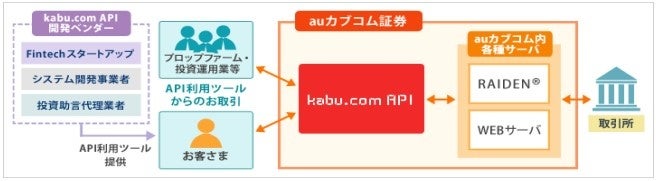 kabu.com APIを活用することにより、サードパーティ事業者は、証券基幹システムに属する部分(複雑な金融法令諸規則に基づく顧客プロパティ管理、勘定系の余力計算、銘柄管理、情報配信基盤、有価証券と金銭の受渡処理等)についてはauカブコム証券の基盤を利用しつつ、UX(ユーザーエクスペリエンス)等のフロントレイヤー部分については事業者様の技術・サービスアイデアの実装にリソースを集中することが出来るため、高度な金融サービスをスピーディに開発・提供していくことが可能となります。 自社システムのAPI開放は、特に、金融サービスの利用者ニーズが多様化する中、伝統的な金融機関が知見を持たない新しい技術領域であるAI(人工知能)、自然言語処理、機械学習、ブロックチェーン、オルタナティブデータ等様々な先端技術に強みを持つスタートアップベンチャー等とのスピーディな提携・事業化の必要性に応えるものです。