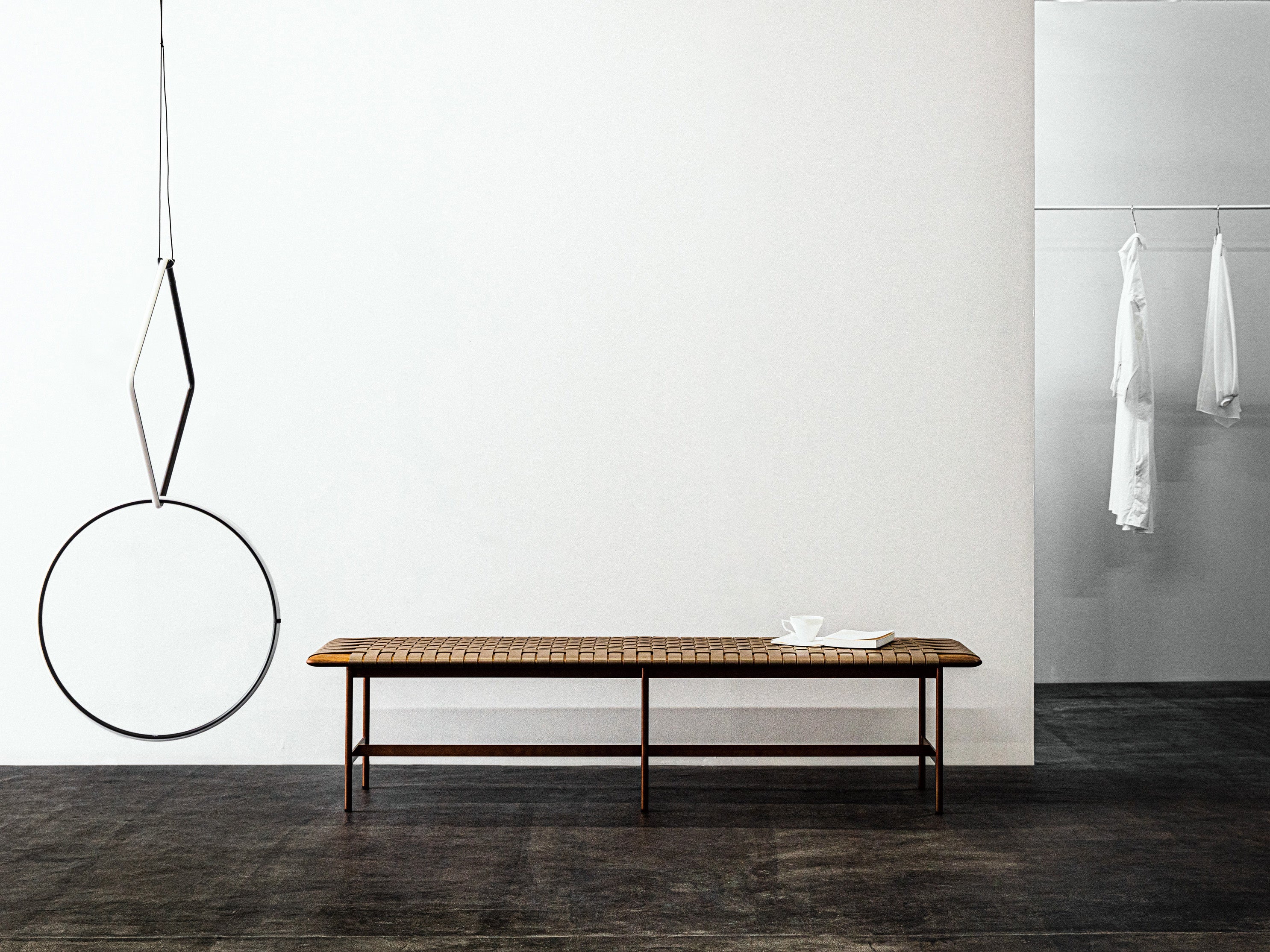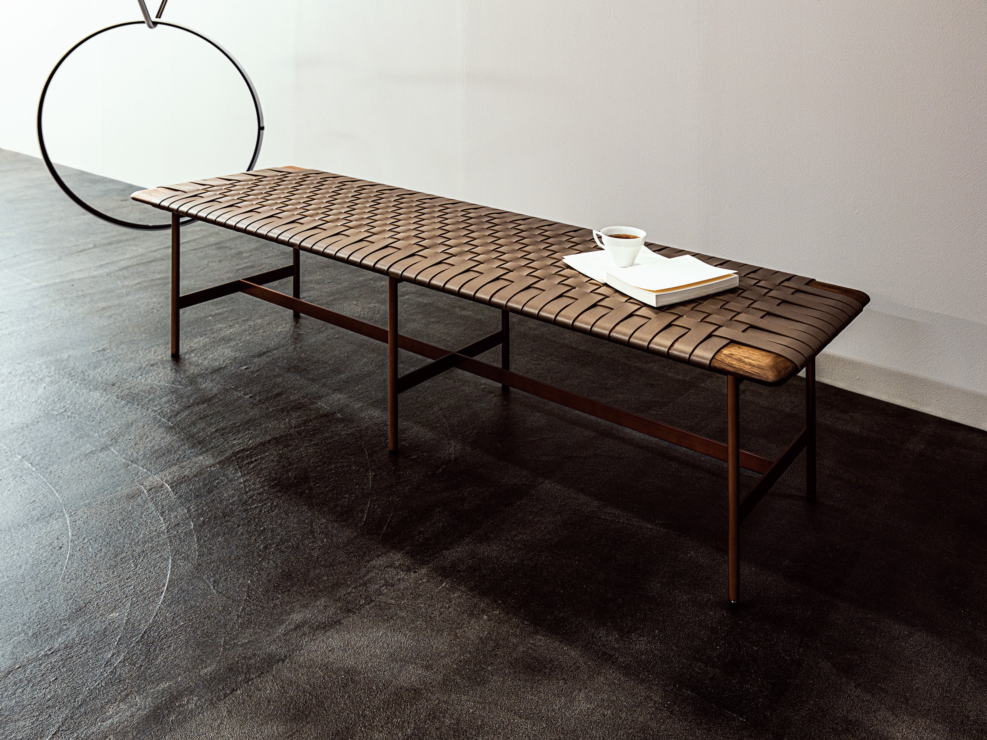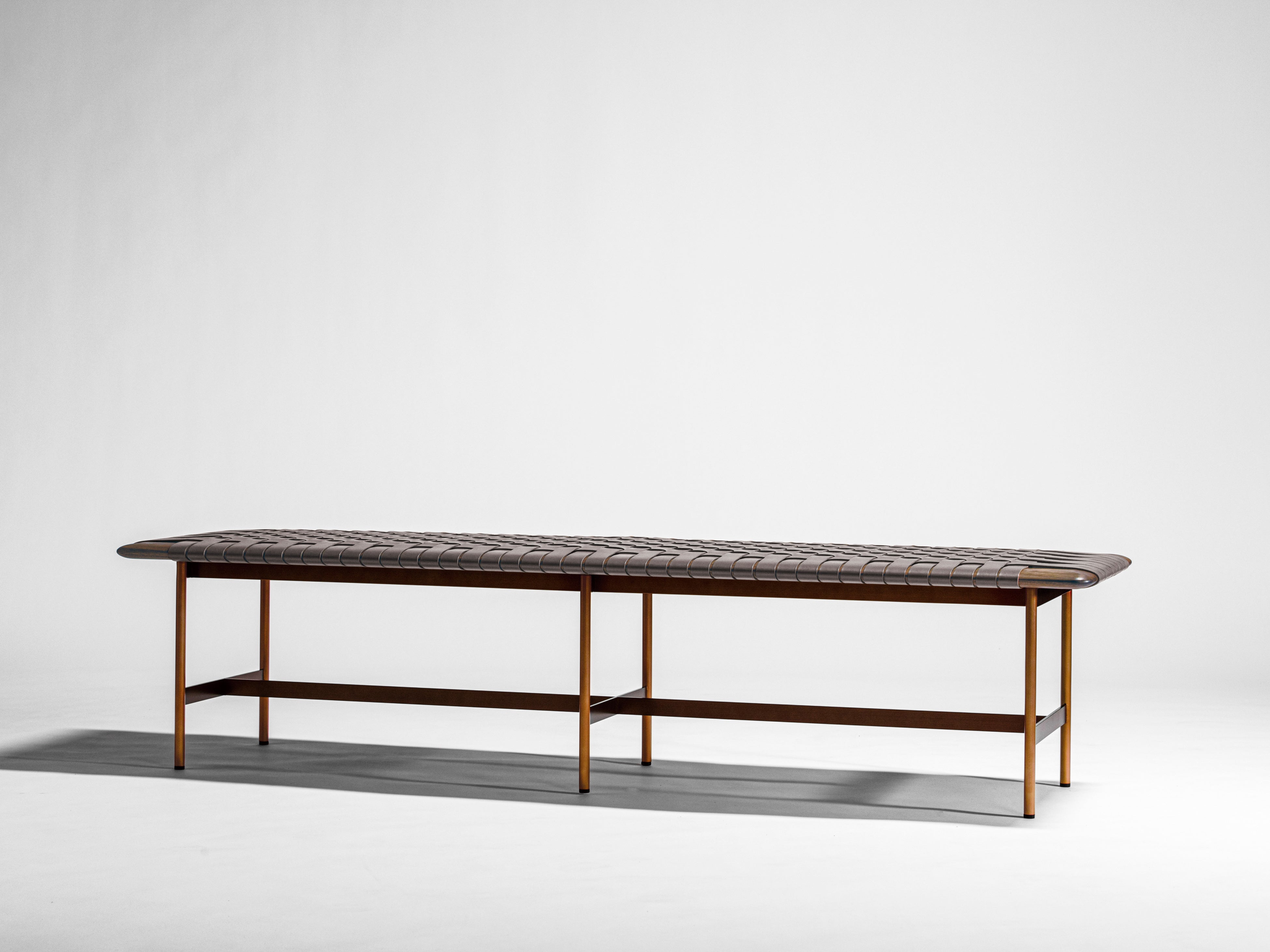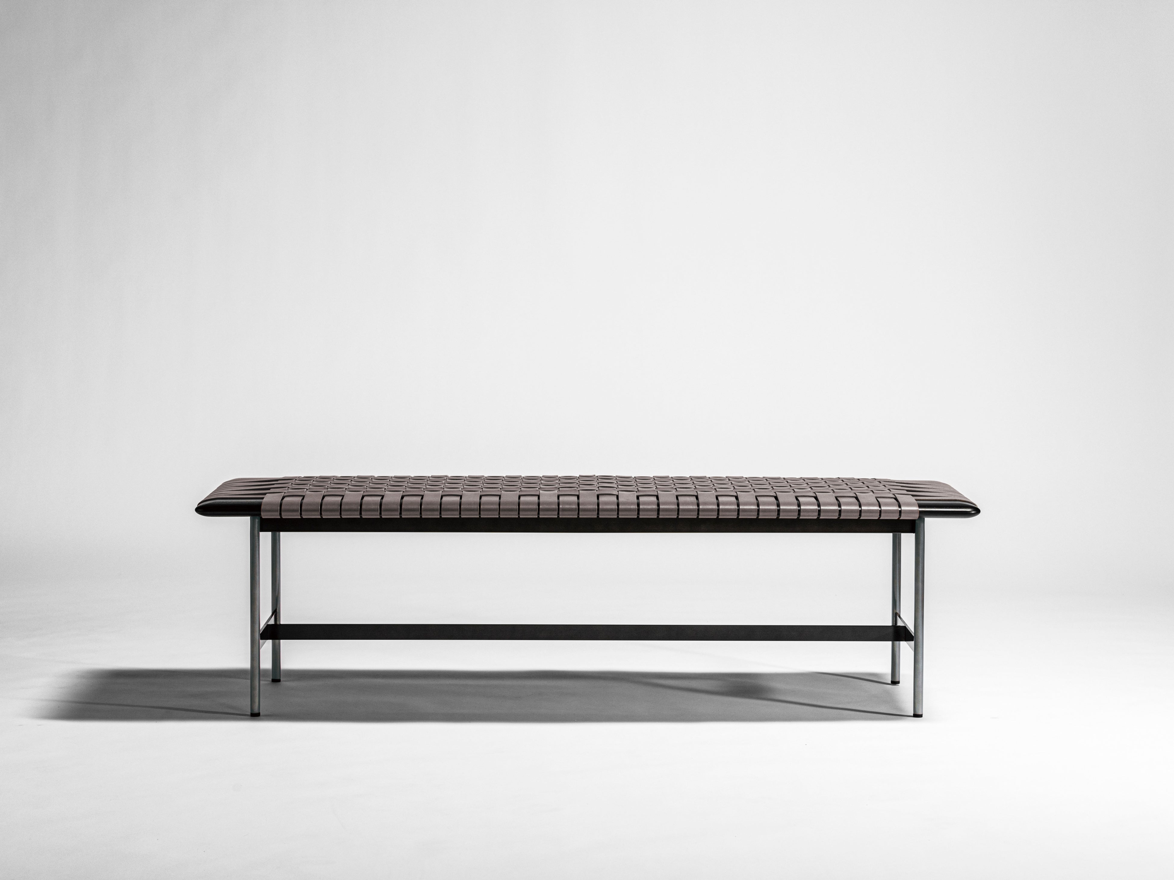 華奢な脚部とボリュームのある座面の絶妙なバランスが美しいMTベンチは、スティール・木・皮革の3種のコンビネーションが印象的なアイテムです。木部フレームに一本一本丁寧に編み込まれた厚革ベルトの凸凹が、座面に豊かな表情を生み出し、丸みのあるエッジの優しい手触りと共に、デザインに温かみと落ち着きをプラスします。巧みな素材使いが際立たせるシンプルなフォルムは、どんな空間にもスッと溶け込む高いフレキシビリティが魅力。単体での使用はもちろん、連続するレイアウトも美しく、美術館や図書館、ロビーなどの広々とした空間で、上質な存在感を発揮します。