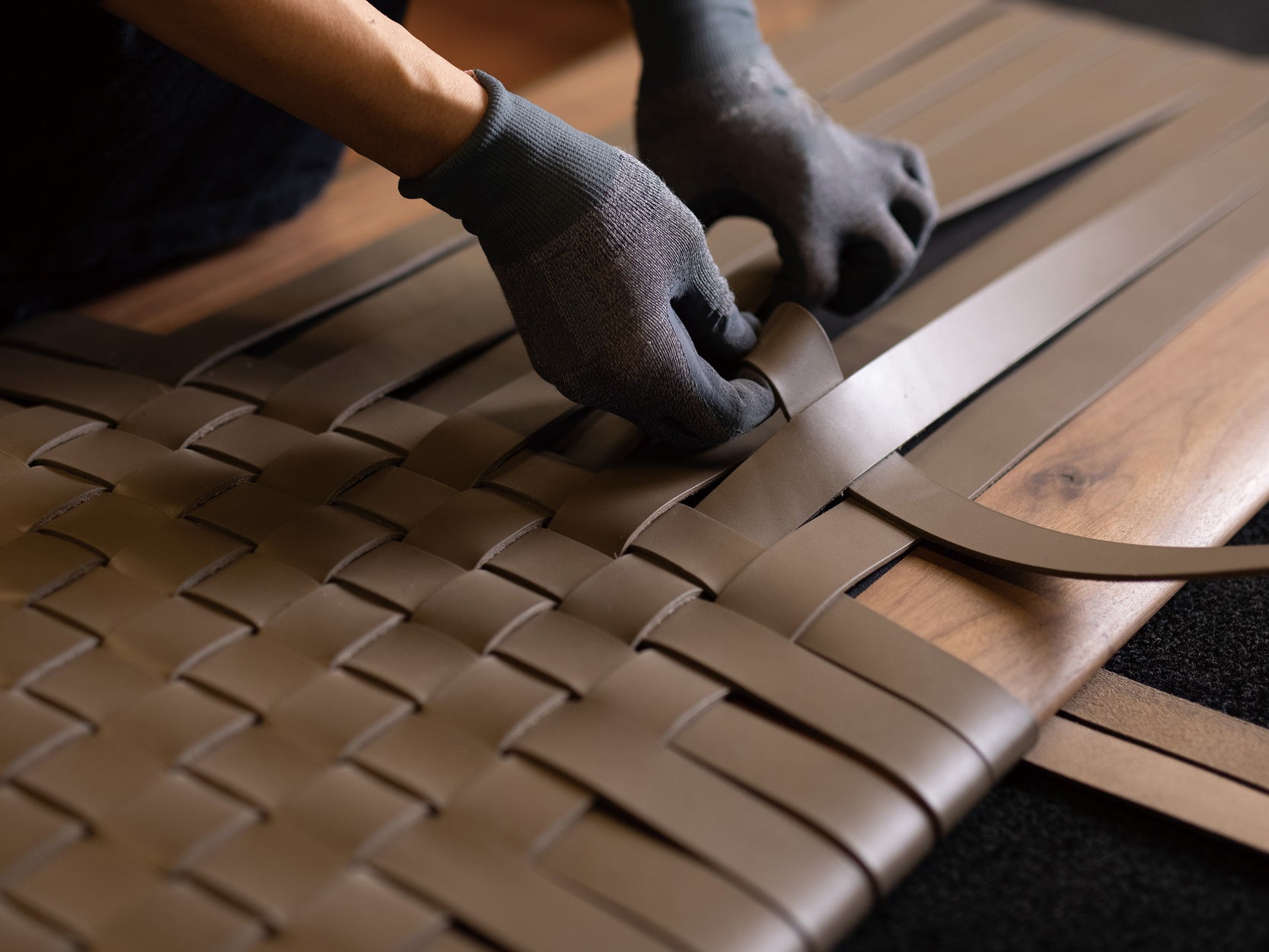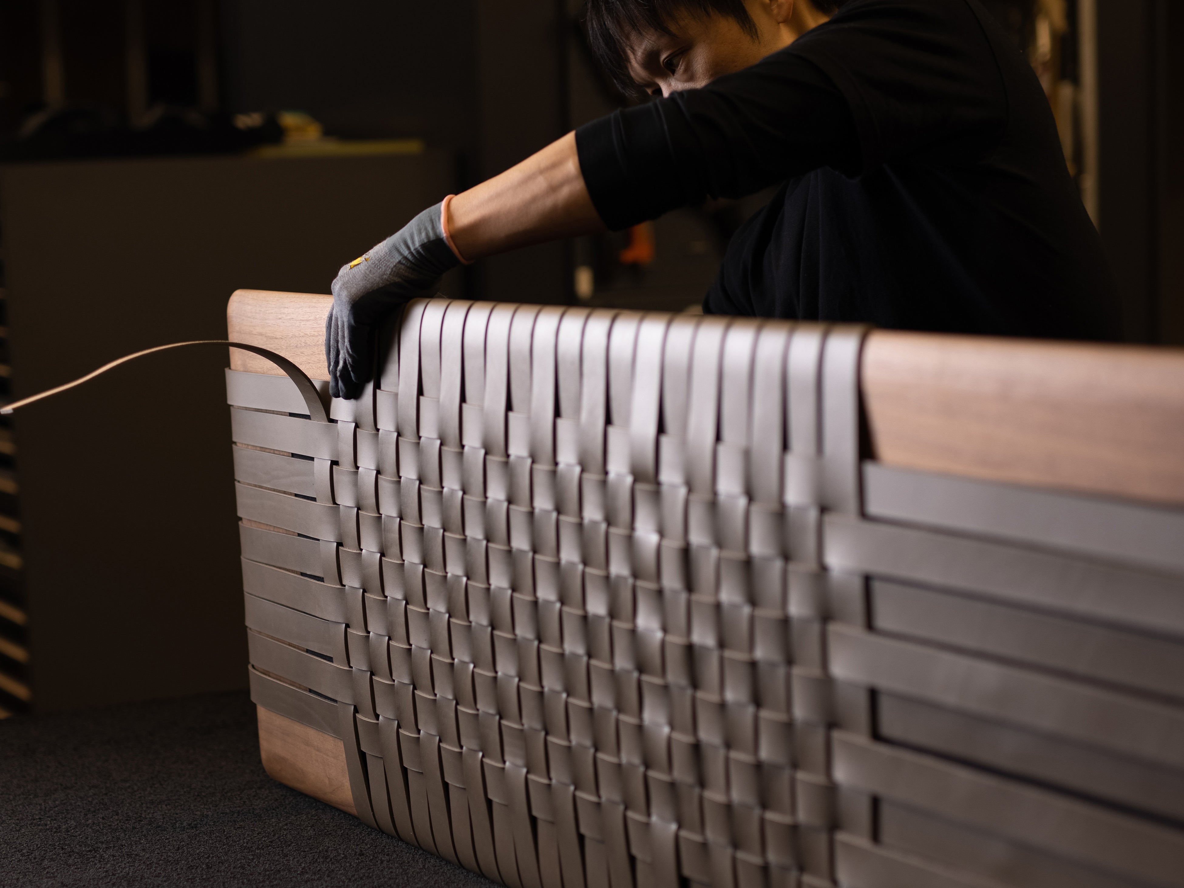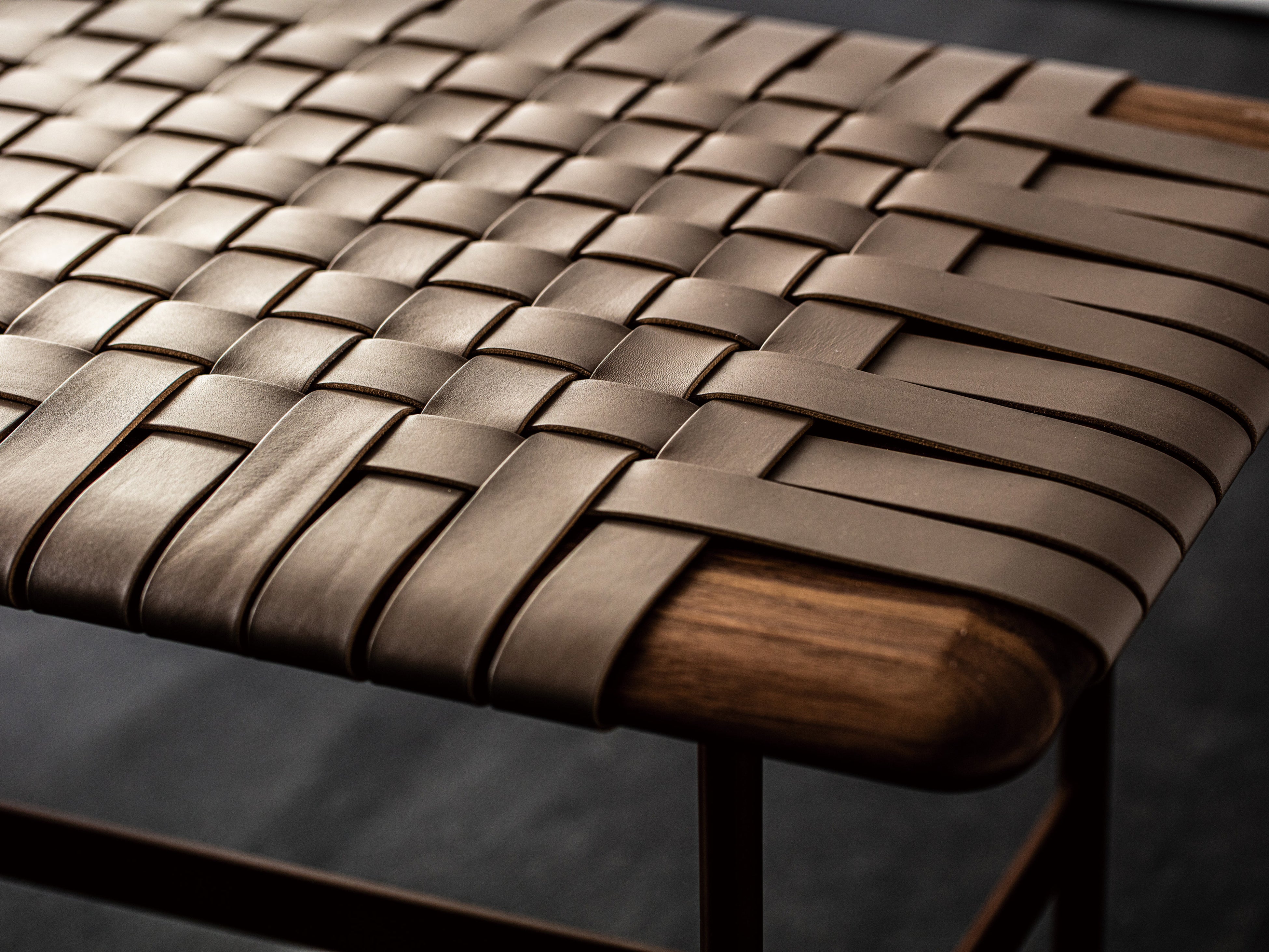 厚革ベルトが編み込まれた座面エッジの柔らかな曲面と構造的な脚部デザインの美しさが魅力のアイテムです。MT BENCHIのこの特徴的な座面は、ゆるやかに曲面を描く無垢材のフレームに、職人が厚革ベルトを一本一本ていねいに編み込んで作り上げています。絶妙に編み込まれた厚革ベルトが生み出す陰影や軋みが、落ち着いた表情と確かな座り心地を実現します。上質な素材使いと洗練されたフォルムは、職人の優れた手仕事が可能にしたもの。こうした職人たちの巧みな手仕事が、リッツウェルの独特な世界感を支えています。