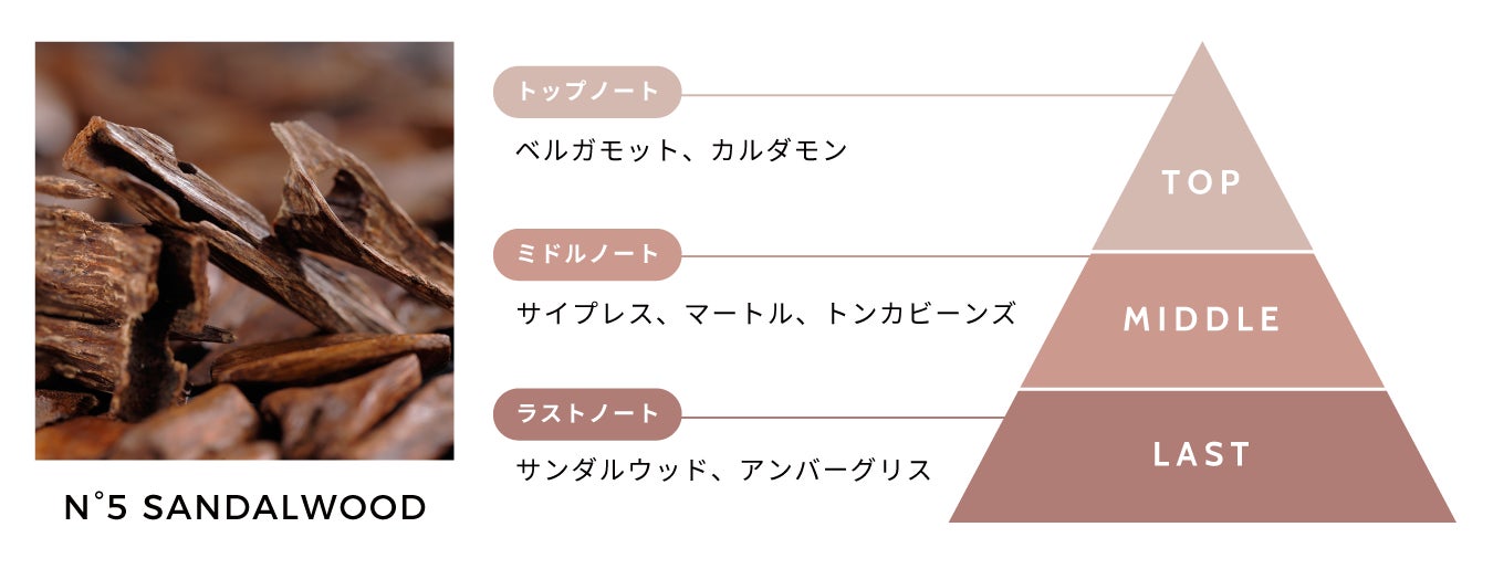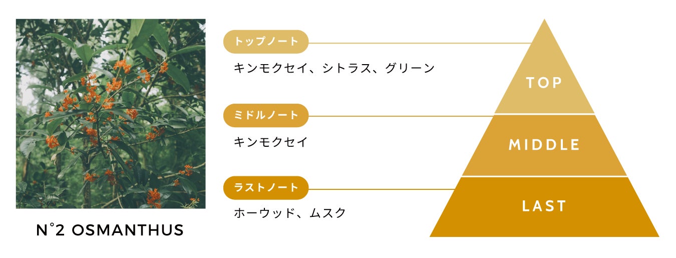 香 り:2種(N°2 OSMANTHUS、N°5 SANDALWOOD)