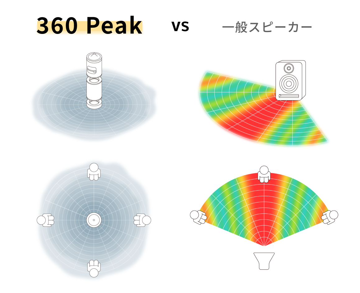 一般スピーカーによくある、立ち位置によって音質や音量のムラが出る問題を解決し、どの位置にいても最高の音質が味わえるように。