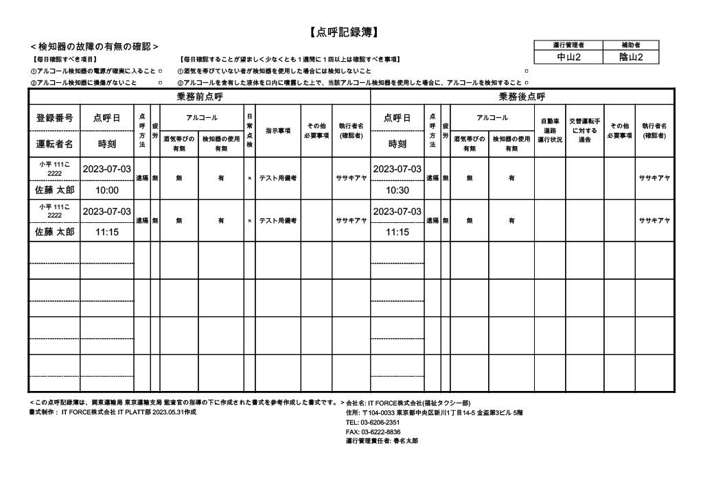 3) 測定した検査結果は、そのままクラウドに1年間保存。また、運転者名や点呼日時などを記録する「点呼記録簿」として用紙に出力できる機能を搭載しています。
