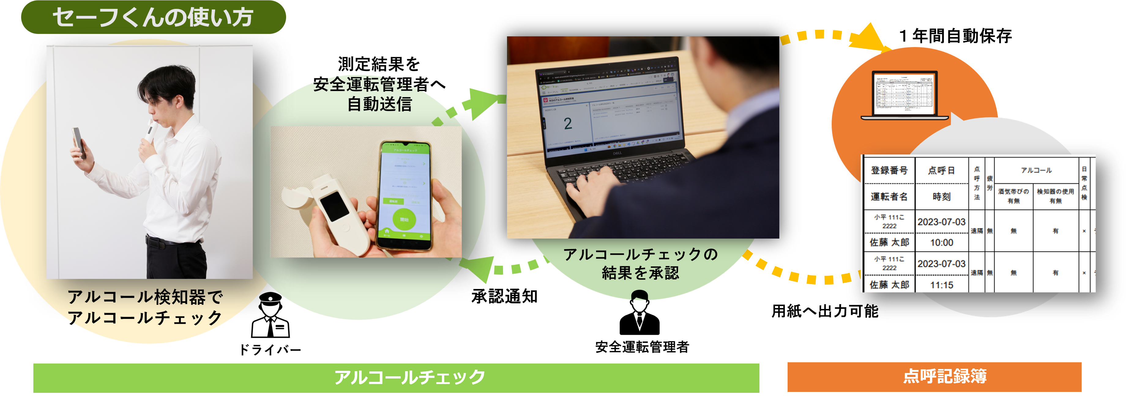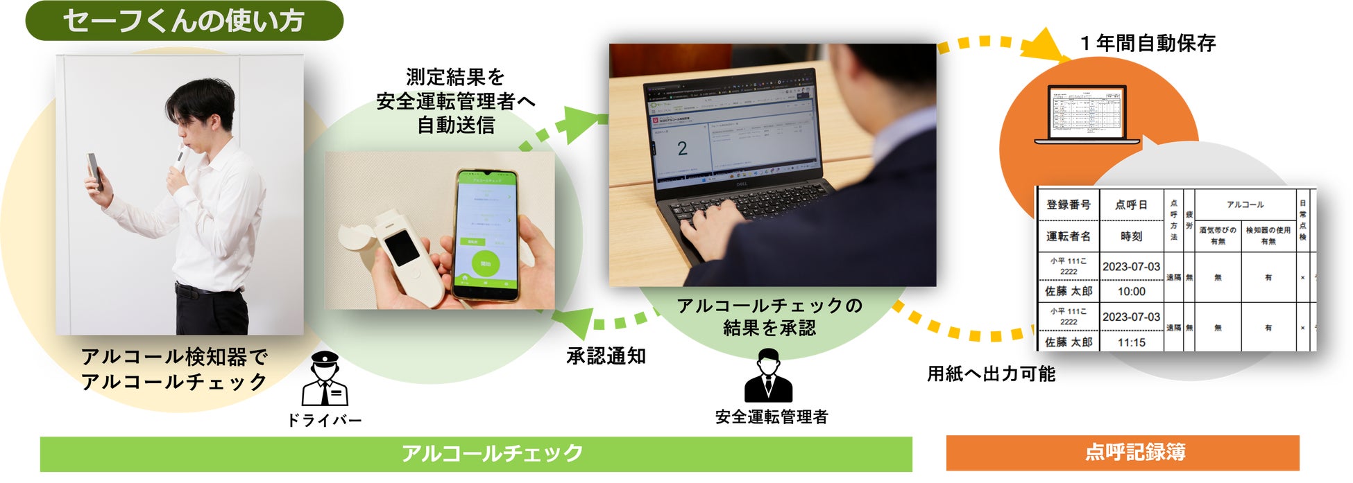 1)ドライバーは、場所や時間にしばられず、約30秒でアルコールチェック報告が完了。安全運転管理者は、パソコンやタブレット、スマートフォンなどの画面上で結果を確認(酒気帯びの場合は異常を通知)、承認すると結果はドライバーのアプリに通知されます。ドライバーは、速やかに運転業務を開始・終了できます。