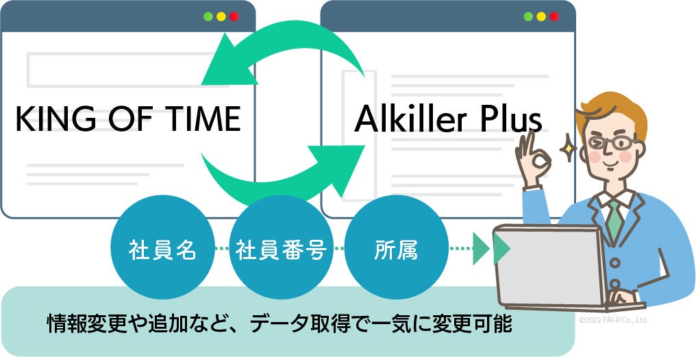 登録済のKING OF TIME内の所属、社員名、社員番号のデータをアルキラーPlusに連携することで、社員情報の追加や更新にも対応、管理者は手間のかかる社員情報の登録や修正作業を二重で行う必要がなく、管理者の業務負担が軽減されます。