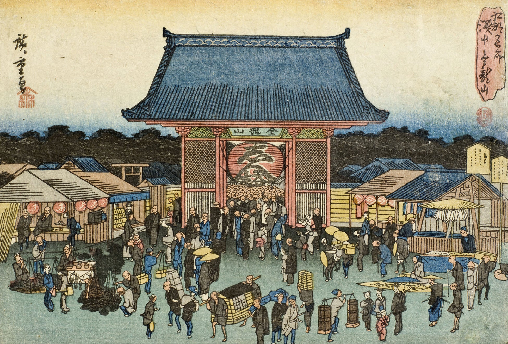 The landmark of Asakusa, the Kaminari Mon Gate of Senso -ji Temple, stands in an area that was once one of Edo’s most vibrant entertainment districts.