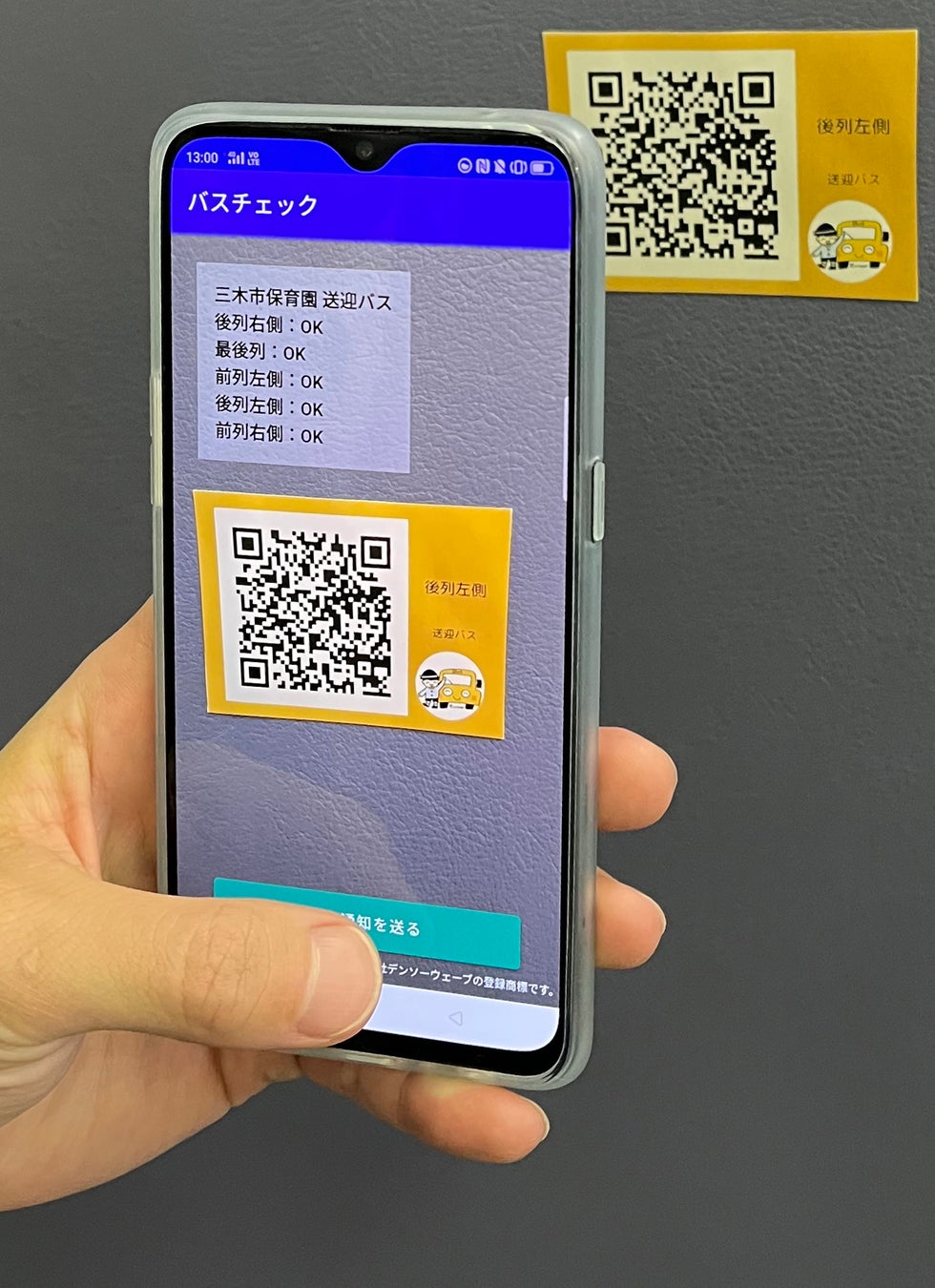 運転手やスタッフによるバス車内の見回りの際に、スマホで壁面に貼られた複数の「QRコード」シールを読み取ることで、車内を確認したことが、リアルタイムに園関係者等に通知できる仕組みです。