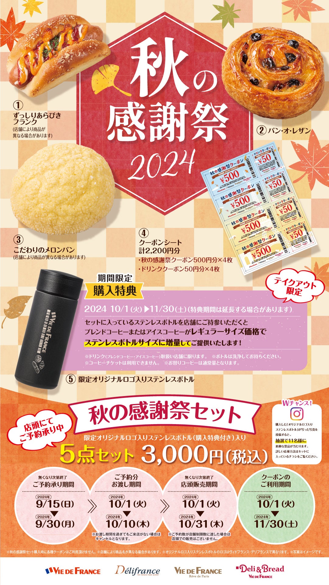 【ヴィ・ド・フランス】9/15(日)~お得な『秋の感謝祭セット』予約開始!~限定オリジナルステンレスボトル入り~Wチャンスの特典付き!