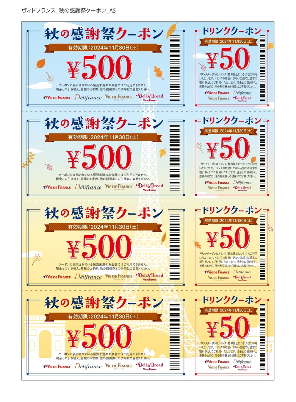 ②クーポンシート(秋の感謝祭クーポン500円分×4枚、ドリンククーポン50円分×4枚:計2,200円分)