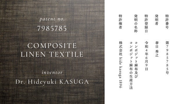 株式会社hide kasuga 1896(本社:東京都港区、代表取締役 春日秀之)は、この度、出願しておりました「コンポジット麻布及びコンポジット麻布の生産方法」について、特許を取得したことをお知らせいたします。