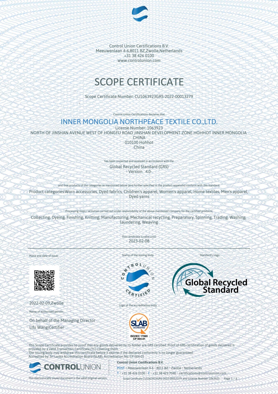 ホリゾン株式会社は内モンゴル自治区にある自社工場(NorthPeace Textile Inc.)にて国際認証のGRS(Grobal Recycle Standard)を取得しました。