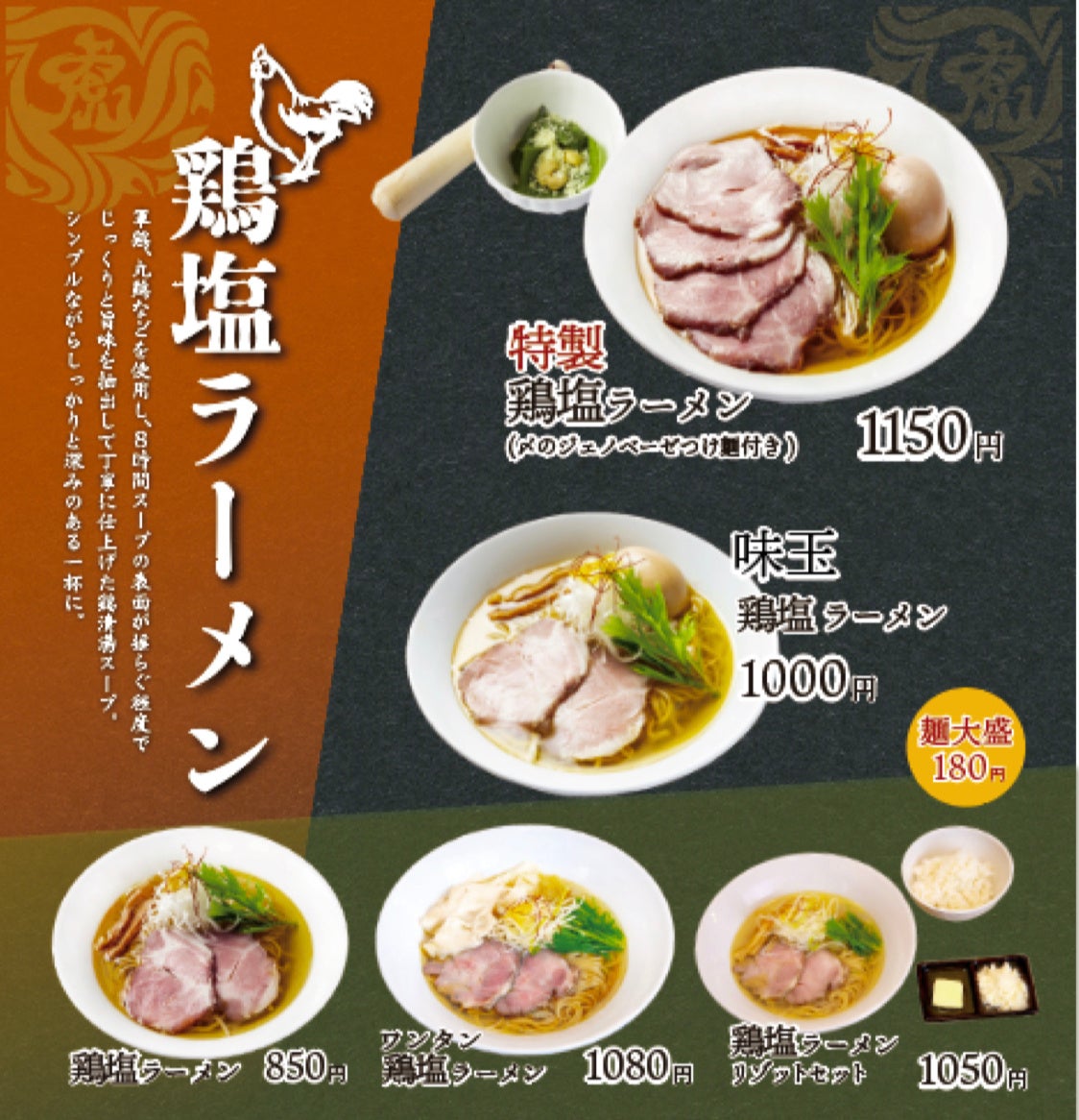 ぐり虎代表作の鶏塩ラーメンは、見た目はあっさり、味は鶏の旨みたっぷり上品な味わいだ。軍鶏、丸鶏などを贅沢に使用し、八時間スープの表面が揺らぐ程度でじっくりと旨味を抽出して丁寧な清湯スープに仕上げている。海と山と湖で採れた日本、イタリア、フランス、モンゴルなどの数種類の塩を厳選して使用し、昆布、椎茸、鰹節などの旨味を重ね寝かし育て合わせることで、芳醇な香りと旨みが極限まで引き出され、鶏の旨みが鼻に突き抜ける珠玉の一杯!