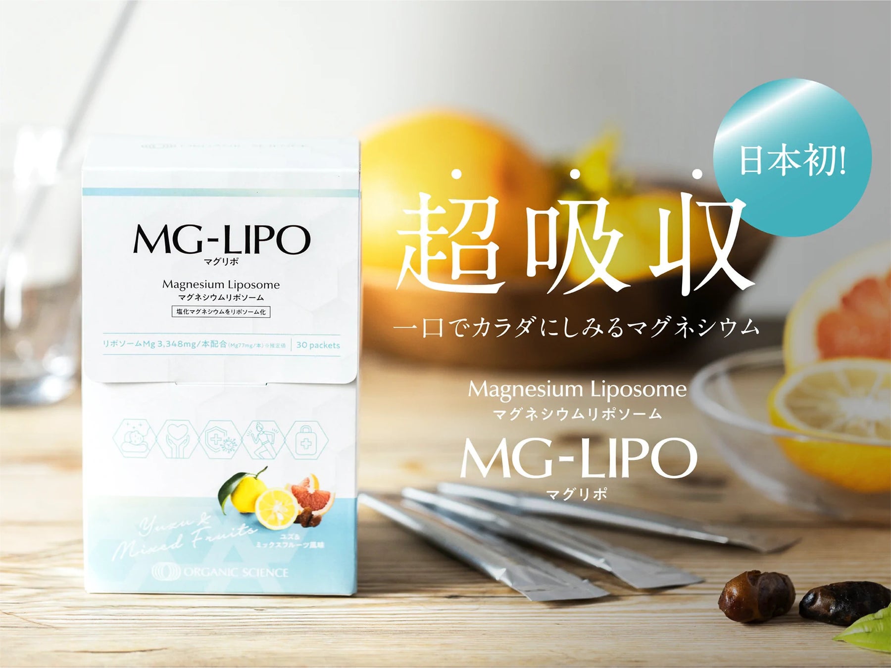 マグネシウム摂取の重要性を普及させること目指し、マグネシウムを豊富に含む天然由来の「マグバーム」等の製品を販売するオーガニックサイエンス株式会社(本社:東京都港区、代表:鎌田貴俊)は、新製品「MG-LIPO」(マグリポ)を2023年2月6日に発売します。日本初となるリポソーム化マグネシウム「MG-LIPO」(マグリポ)は、経口でのマグネシウム摂取の効率化を目指し、リポソーム分子の直径100nm以下を実現することで高い吸収率を叶えました。マグネシウム特有の苦さやエグみを解消し、ゆず果汁とデーツ果汁でさっぱりとした爽やかな風味に仕上げた本製品は、毎日の生活に取り入れやすいマグネシウムサプリメントとして、皆様の生活に健康と幸せをお届けします。※日本初 自社調べ(2023年1月現在)日本国内製造における「リポソームマグネシウム製品」として