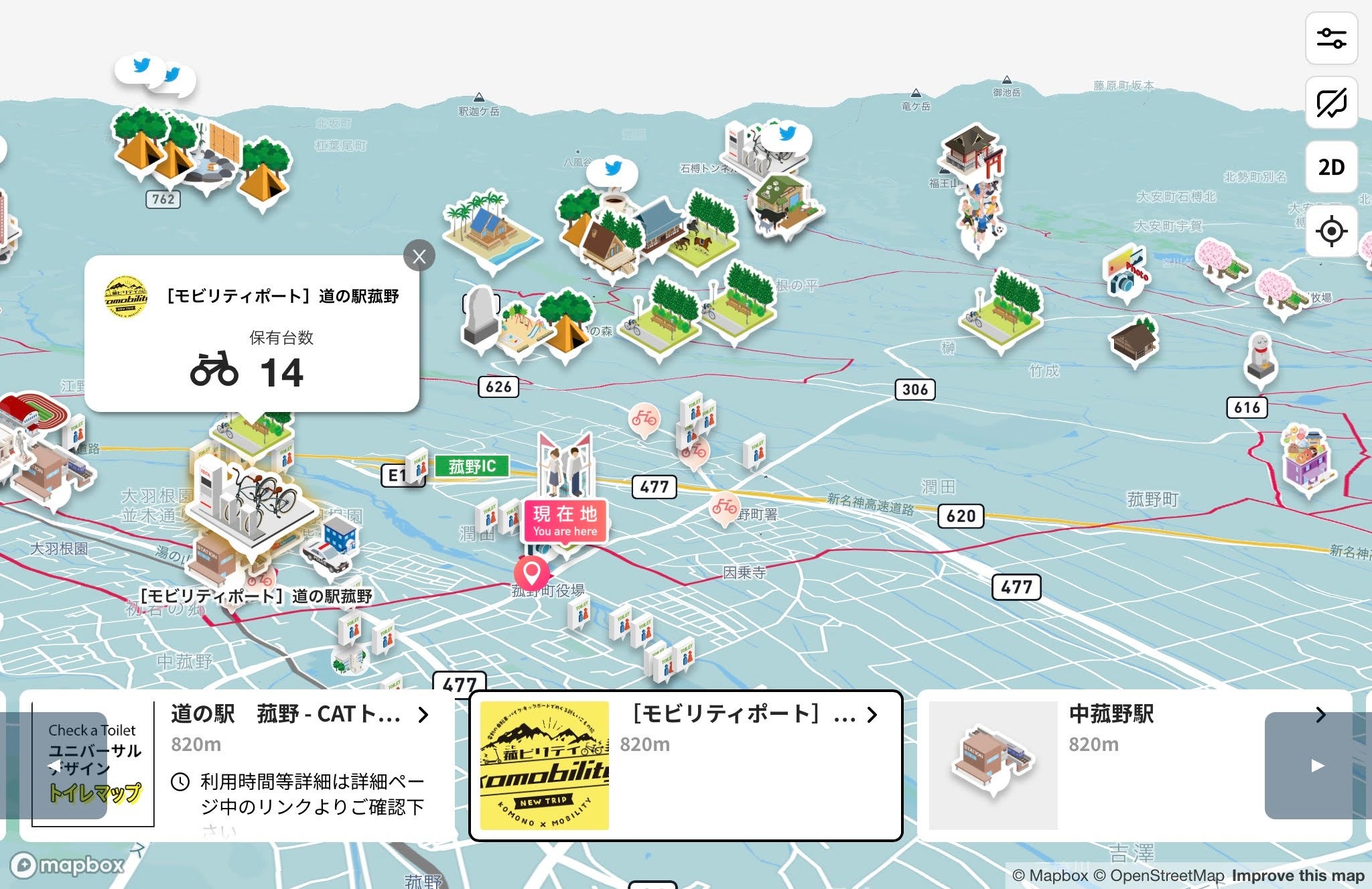 既存のパンフレット等のメディアのコンテンツを活用しつつ、その場所の「今」の魅力をアピールする情報とシステム連携によるリアルタイムな情報表示をマップの上に総合的に組み合わせて見せることで、観光客に臨機応変な判断が出来る状況を提供し、更なるまちの周遊を促します。
