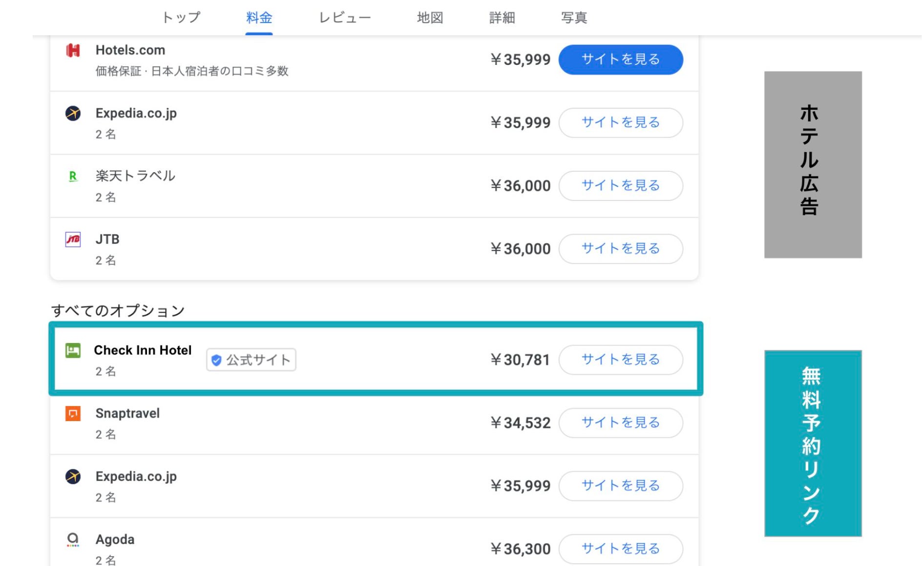 Googleホテル広告には、広告費を支払うことでページ上部への掲載を行う「有償枠」と、広告費なしでページ下部に広告リンクを表示する「無償枠 =Free Booking Link」があります。有償枠・無償枠どちらもCheck Innで対応可能です。