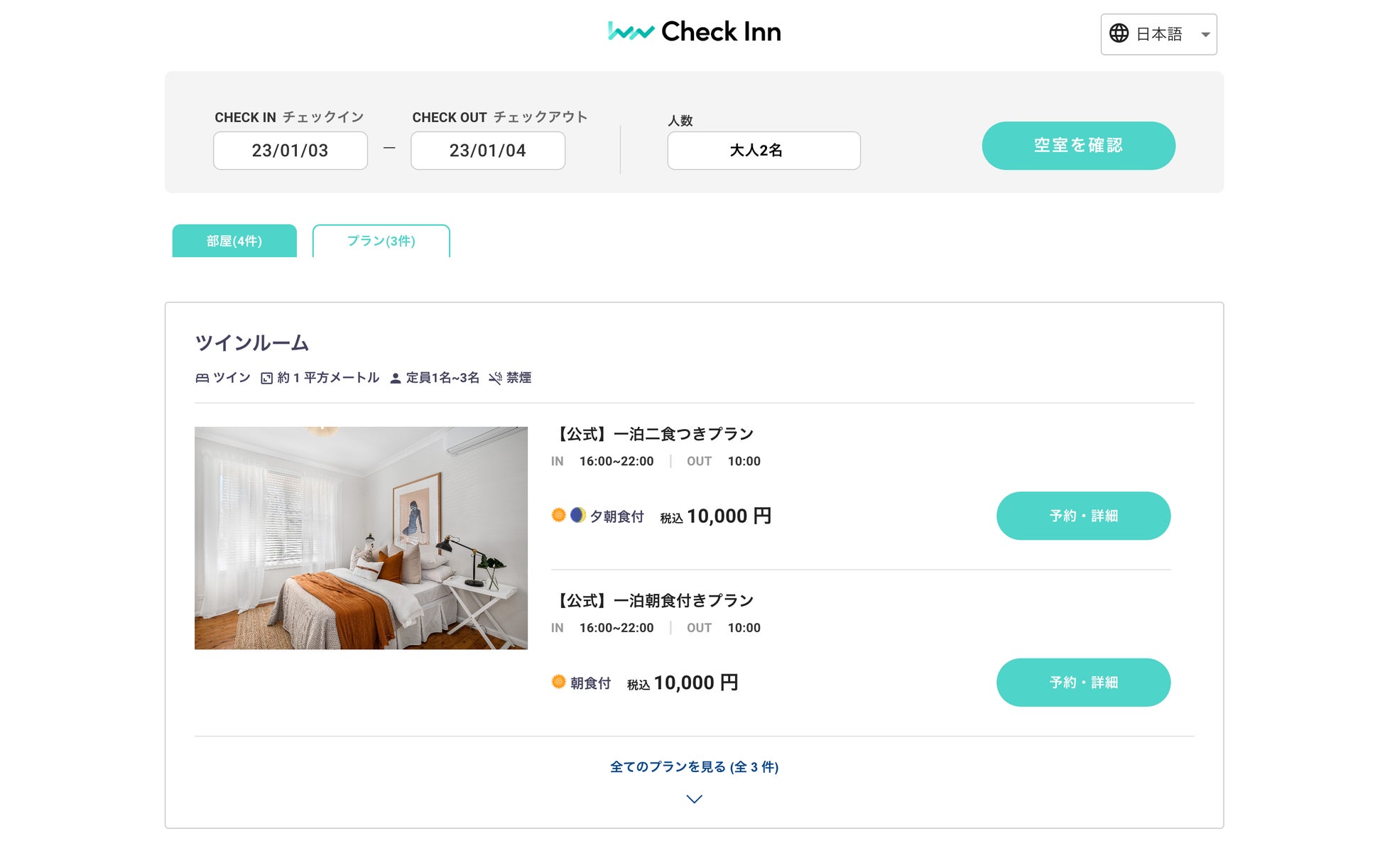 「Check Inn」はサイトコントローラー・自社予約エンジン・PMS一体型の宿泊施設向けオールインワンシステムです。