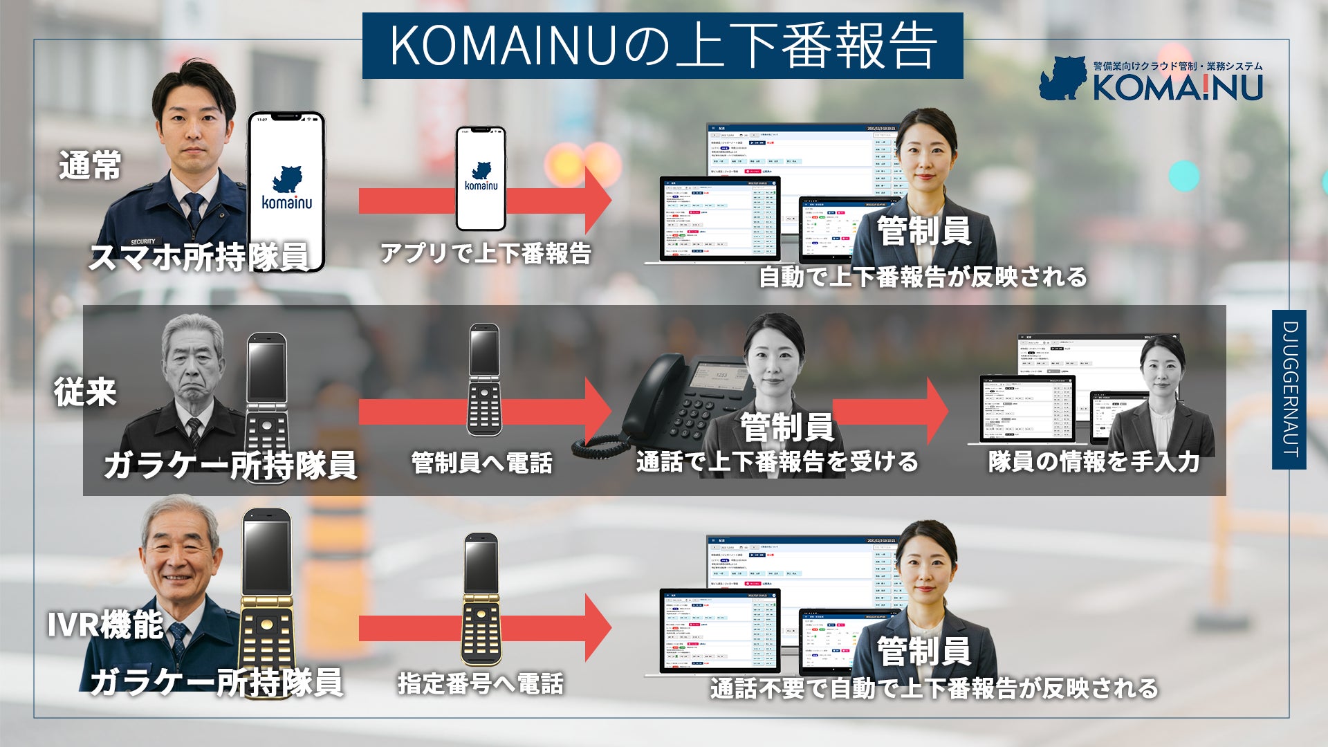 「警備業のバックオフィスを革命する」をミッションとする、株式会社ジャガーノート(東京都渋谷区、代表取締役:平井 智仁 TEL:03-6822-8594)は、当社が提供する警備業向けDXソリューションプラットフォーム「KOMAINU(コマイヌ)」(以下KOMAINU)において、新たに「IVR(自動音声応答)打刻機能」をリリースしました。